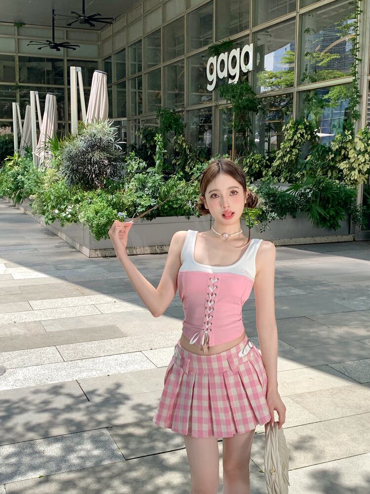 スイートガールスーツ レディース 夏 プリーツ ショート A ライン スカート 対照的色 多用途 スリム フィット レースアップ ベスト 2 点セット 大人ガーリー スウィート キュート カジュアル サマー 夏物 Aライン