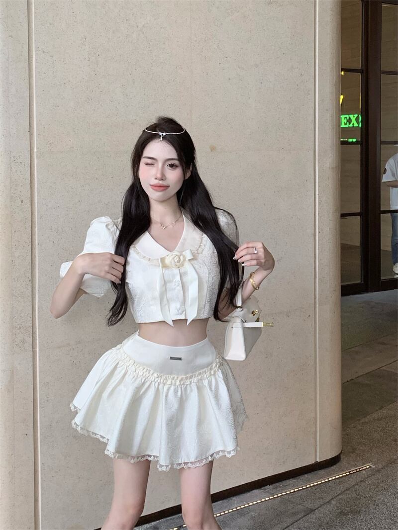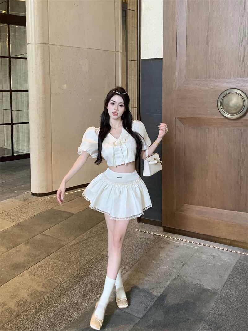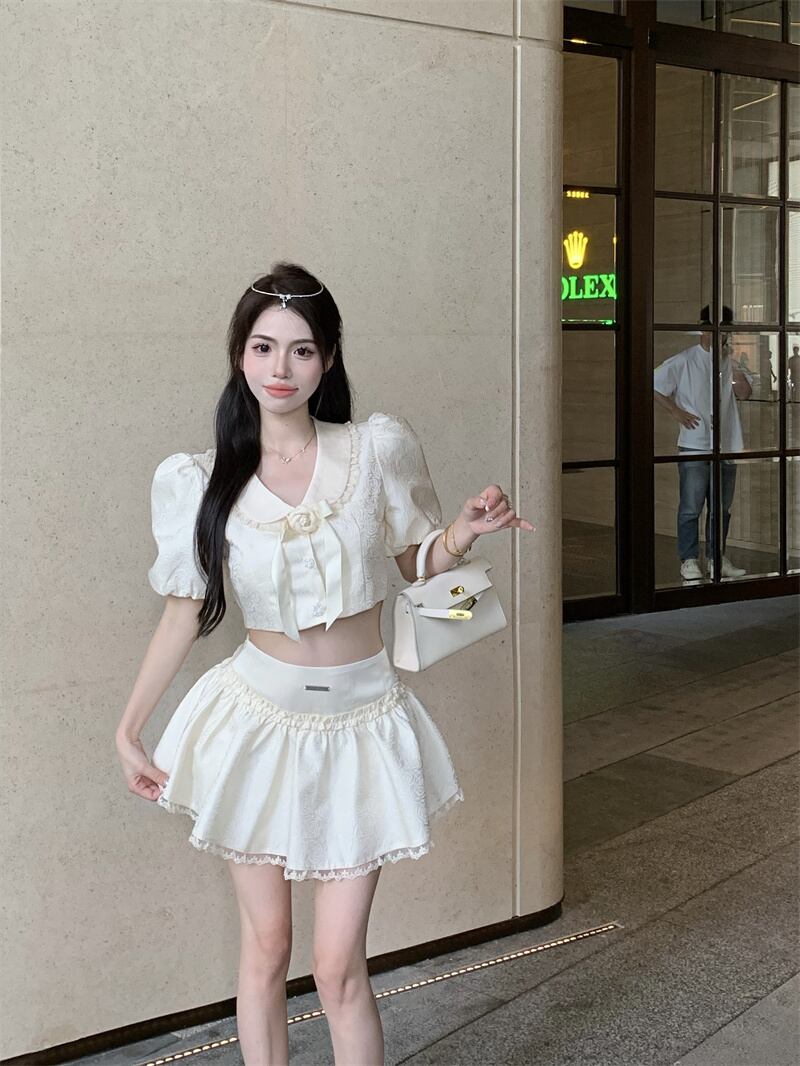 甘いホットガールスーツ夏バブルスリーブショートシャツウエストミニ A ラインスカート 2 点セット服 大人ガーリー スウィート キュート カジュアル サマー 夏物 Aライン