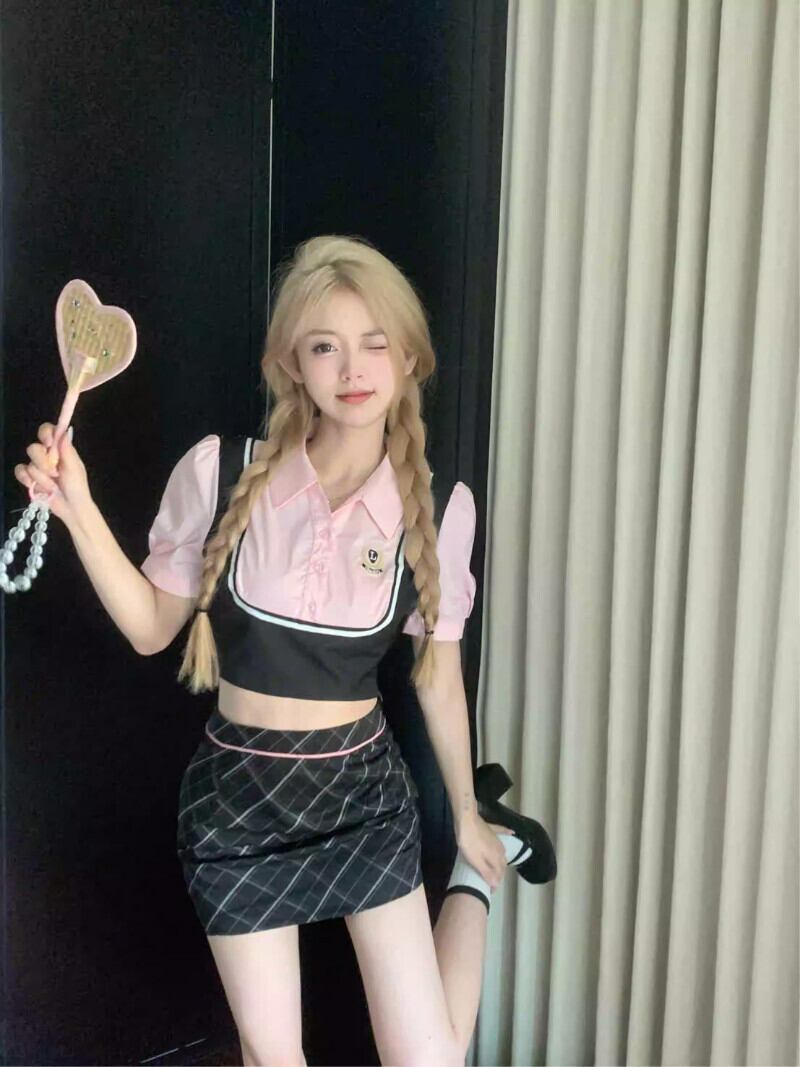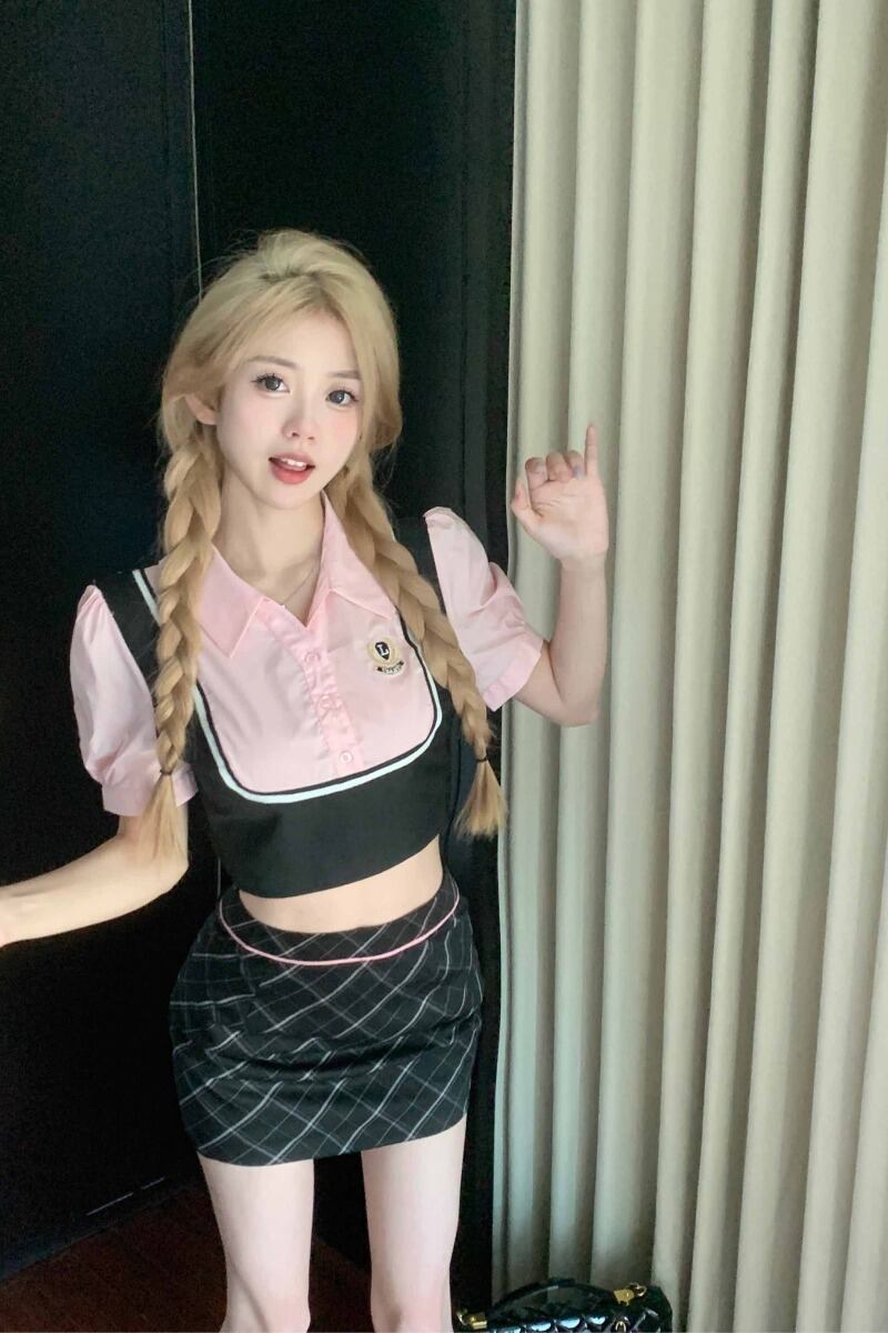 スタイルスイートガールスーツ夏スリムフィットシャツウエストチェック柄ミニスカートツーピースセット服 大人ガーリー スウィート キュート カジュアル サマー 夏物
