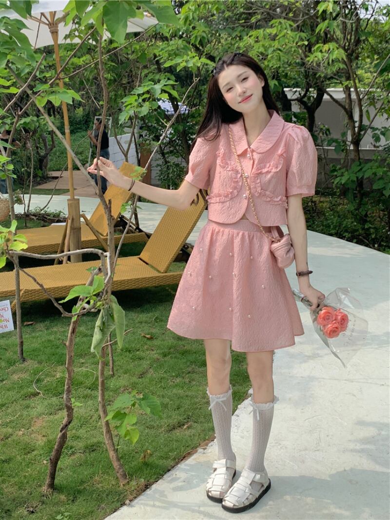 ピンクホットガールズスーツ春ピーターパンカラーシャツウエストスカートツーピースセット服 スプリング 春物