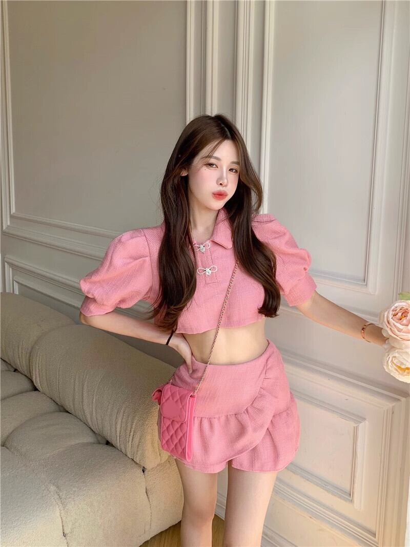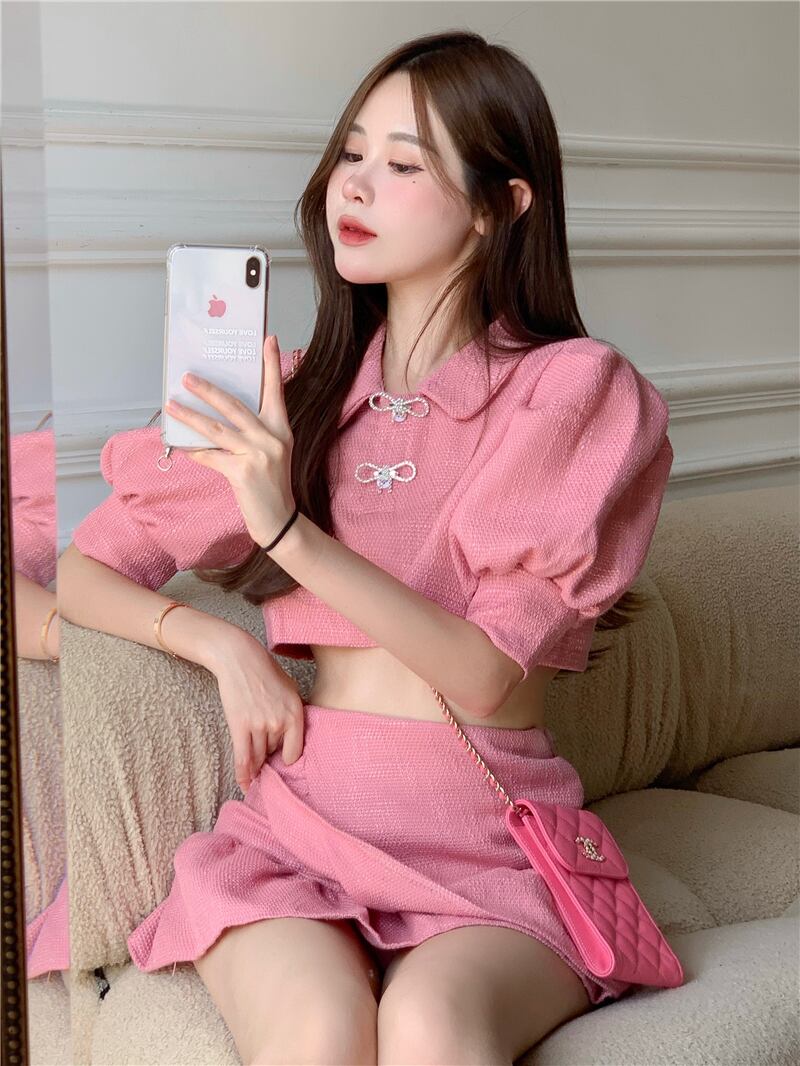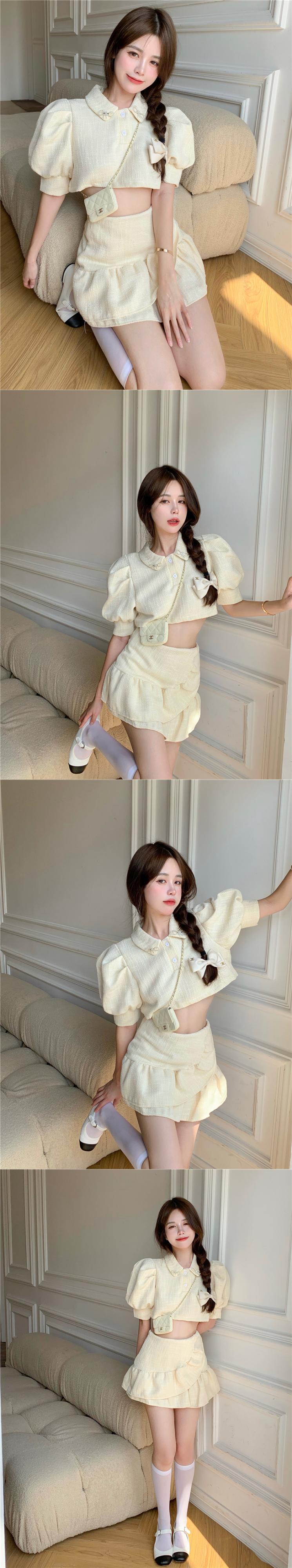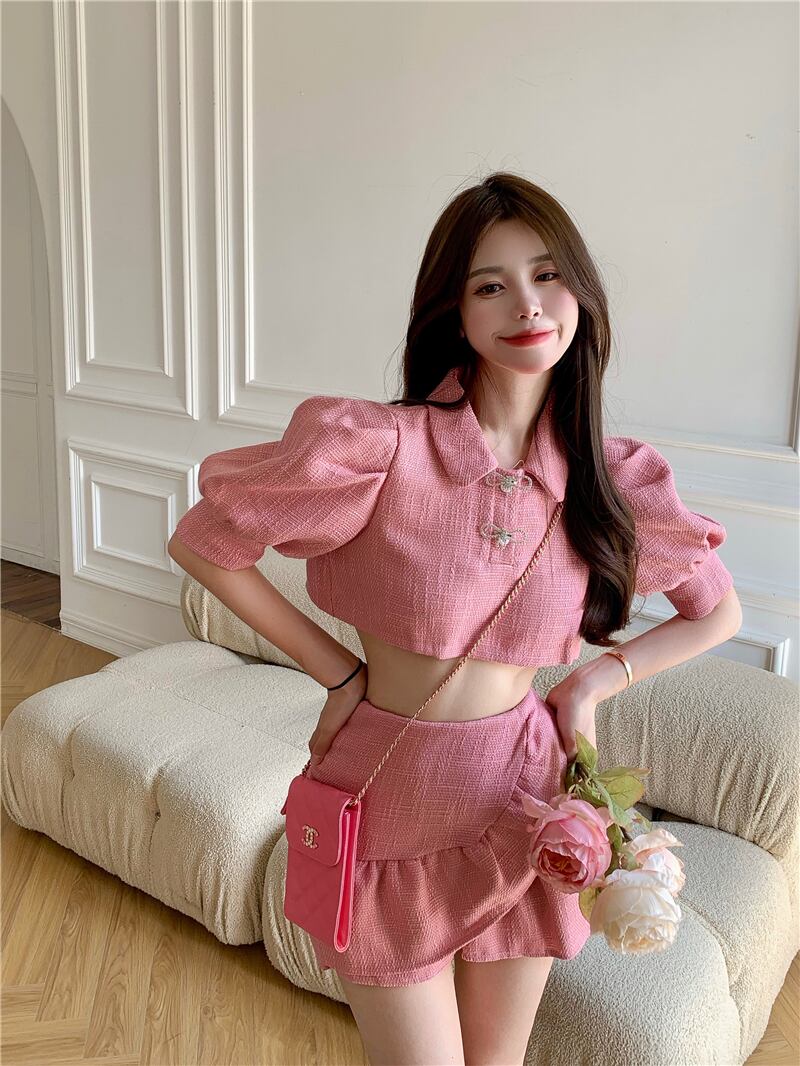 Sweet Girl スーツ レディース 夏 ランタンスリーブ ショートトップ ウエスト ミニスカート 2点セット 服 大人ガーリー スウィート キュート カジュアル サマー 夏物