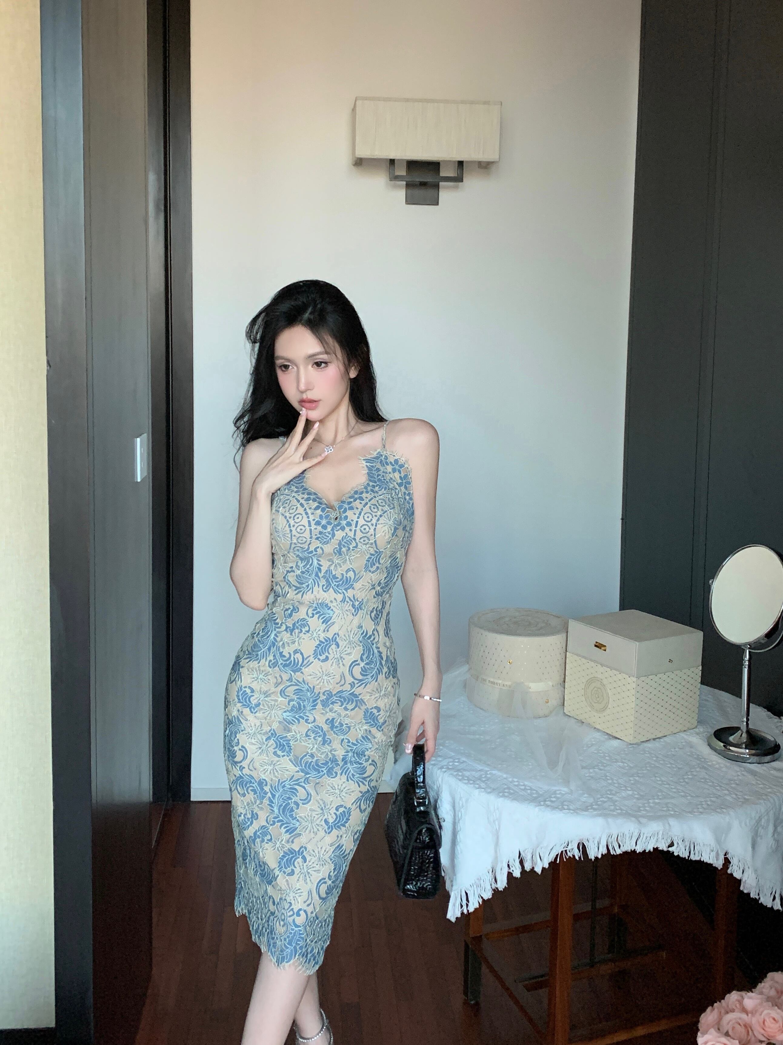 中国ホットガール青と白レースドレス夏純粋セクシースパゲッティストラップミディアムロングドレス服 ホワイト ブルー サマー 夏物 ピュア