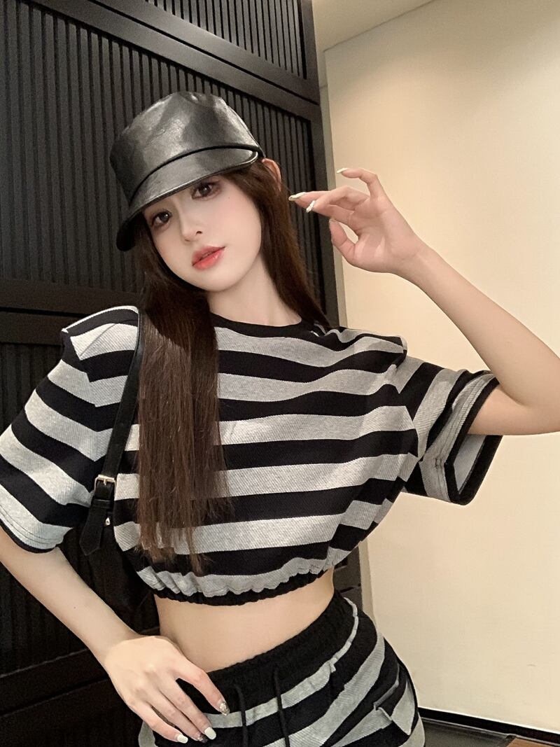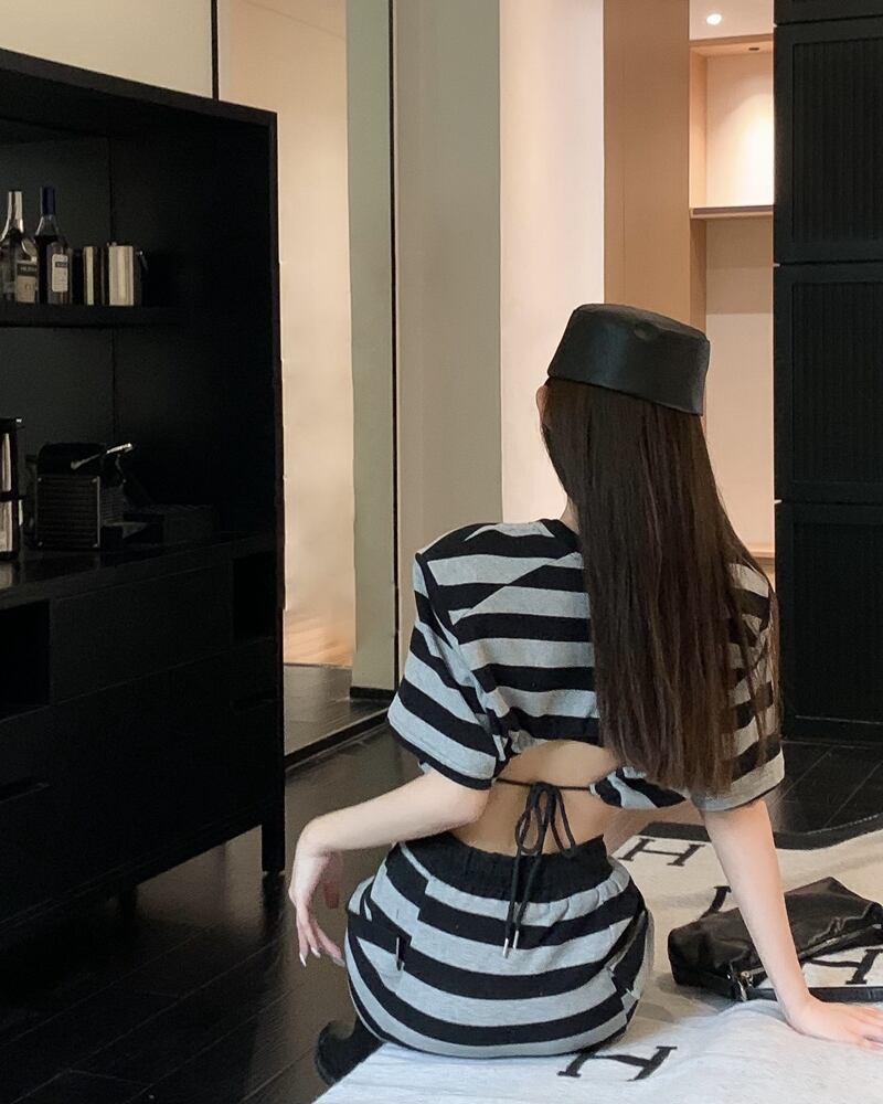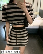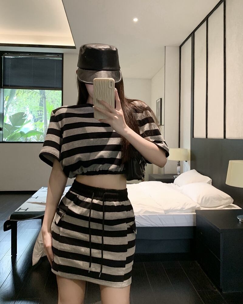 香港ホットガールズスーツストライプレースショートトップ夏ウエスト弾性スカートツーピースセット服 エラスティック 伸縮 サマー 夏物