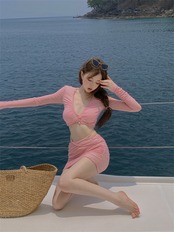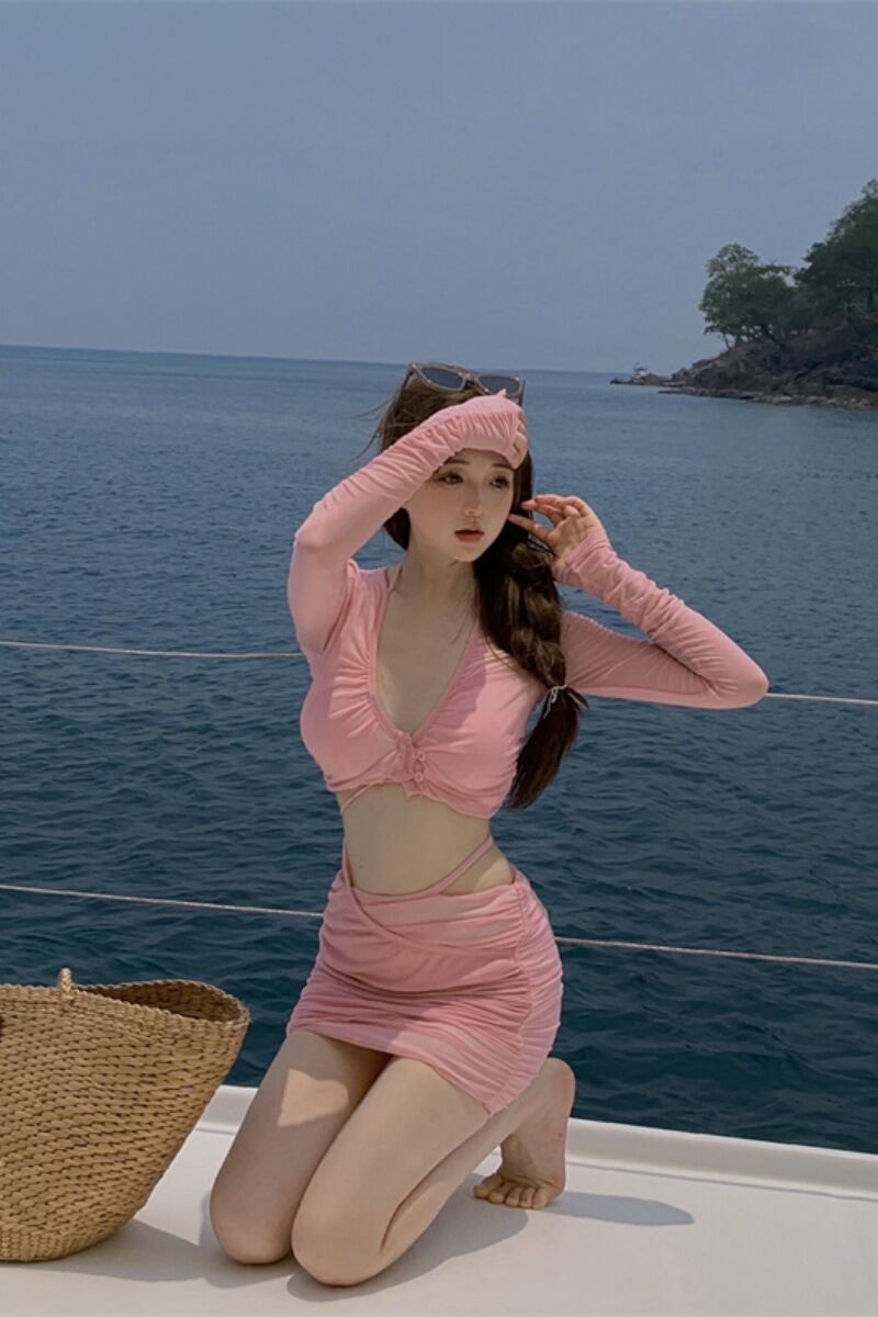 ビーチホリデースタイルスーツ甘いホットガール V ネック長袖日焼け止め Tシャツサマーラップヒップミニスカート 2 点セット ロング 大人ガーリー スウィート キュート カジュアル 夏物 Vネック