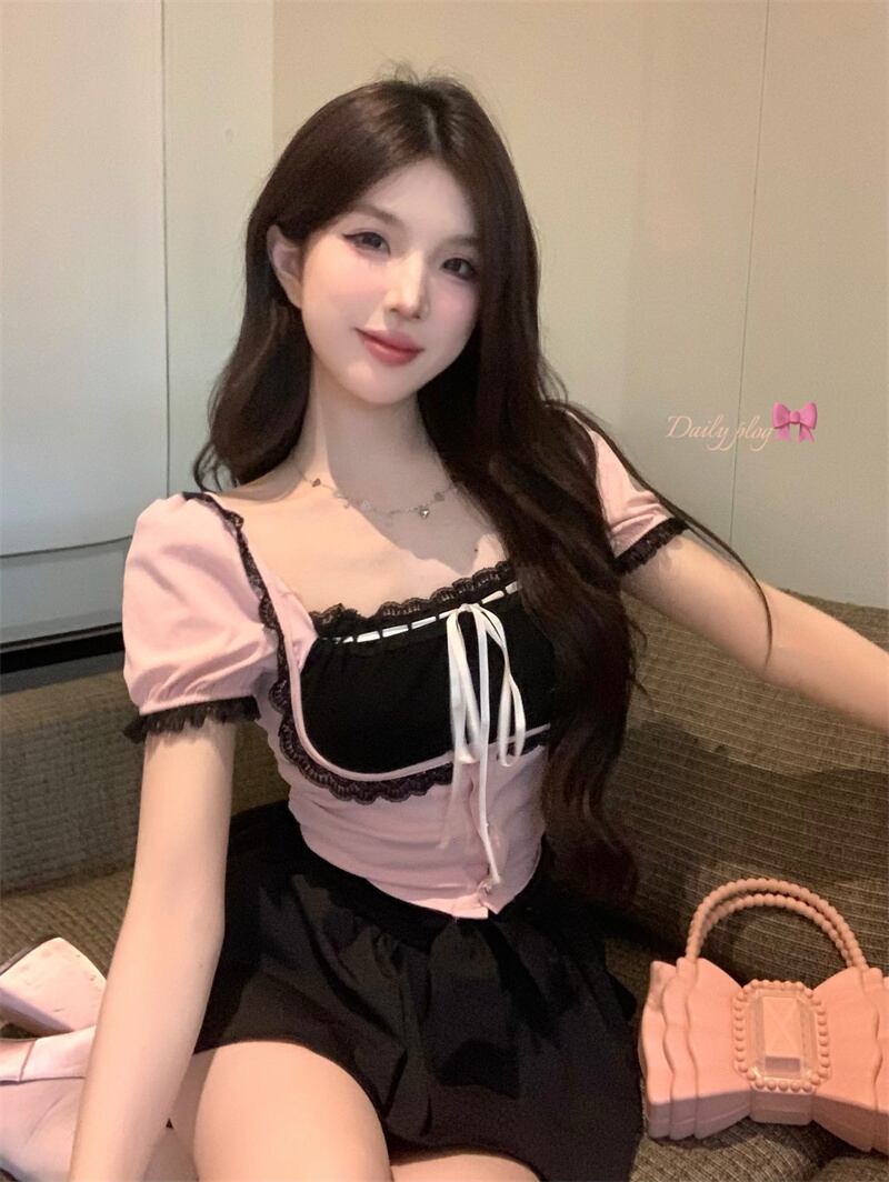 スイートホットガールスーツ夏スクエアカラースリムフィットショートトップふわふわミニスカートツーピースセット服 大人ガーリー スウィート キュート カジュアル サマー 夏物 スクウェア