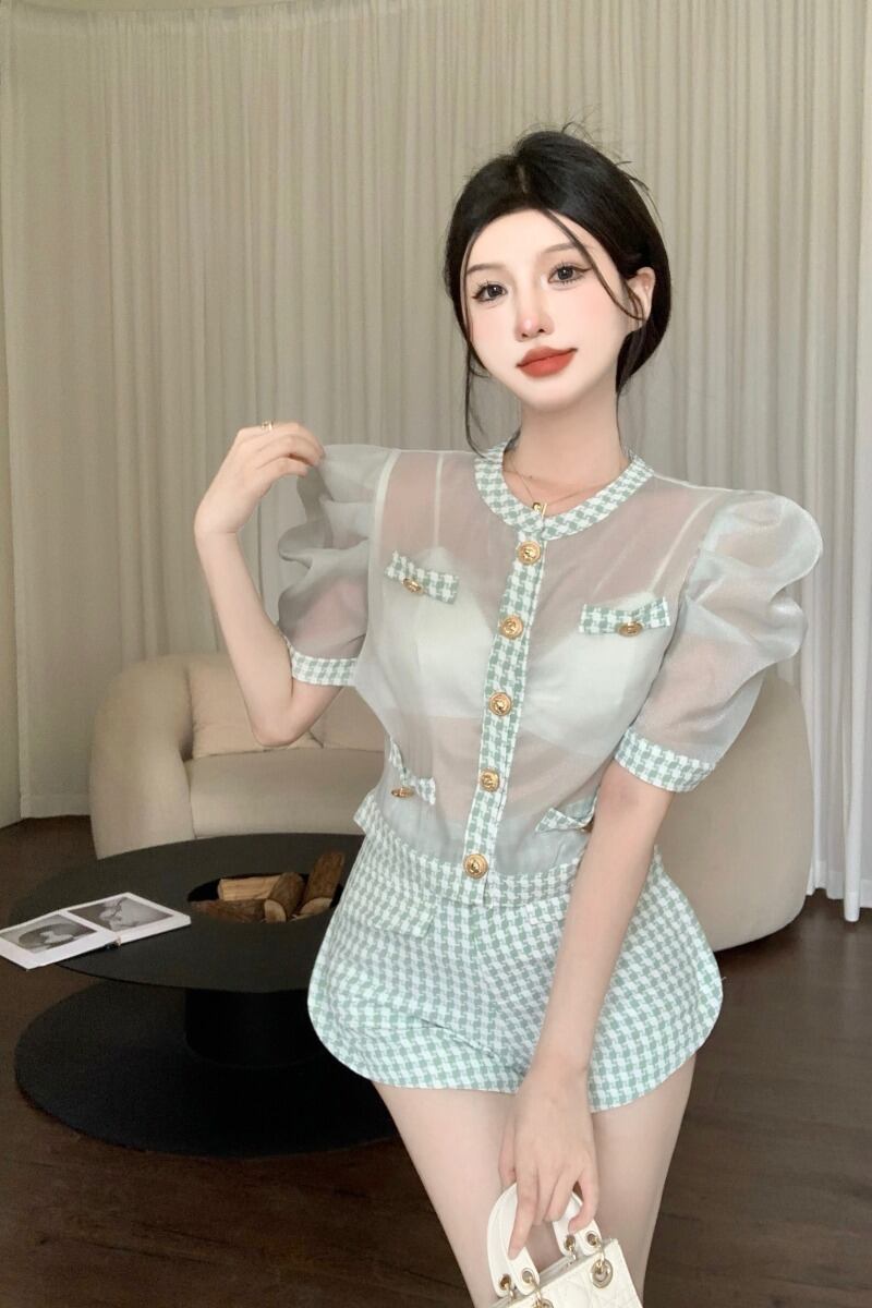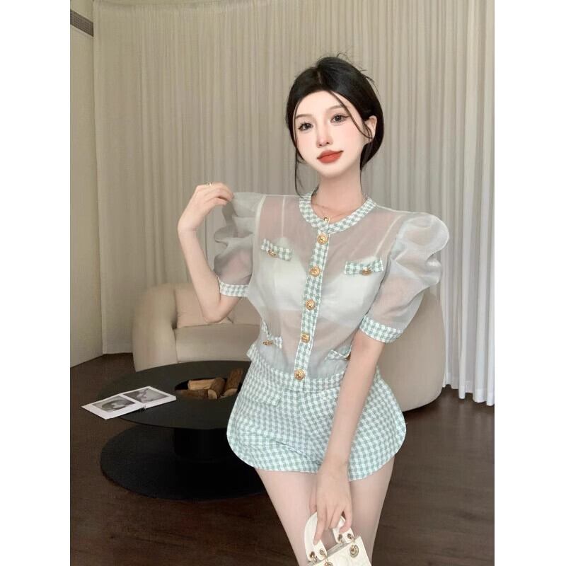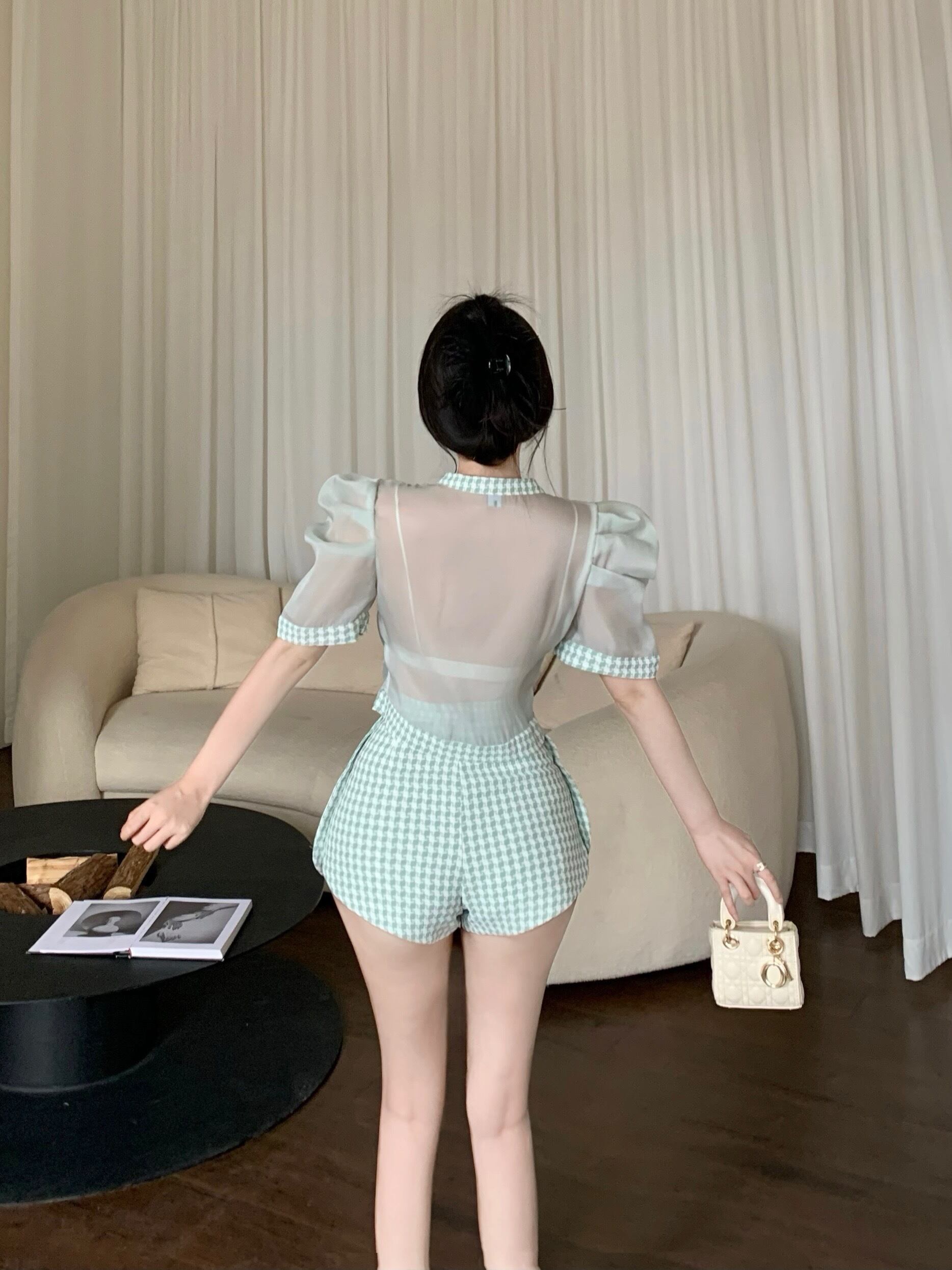 甘いホットガールスーツバブルスリーブ O ネックショートトップウエストチェックパンツ 2 点セット服 レッド 大人ガーリー スウィート キュート カジュアル ショーツ ブルマー Oネック