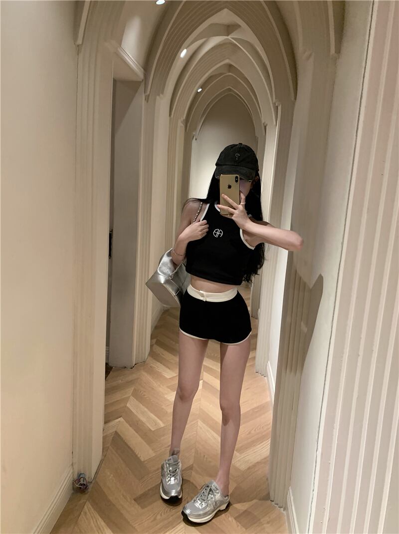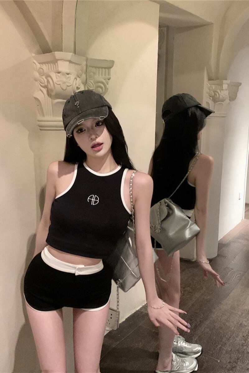 黒と白対照的刺繍スイートクールスーツ夏スリムノースリーブベストショーツ 2 点セット ホワイト ブラック 大人ガーリー スウィート キュート カジュアル サマー 夏物 ブルマー