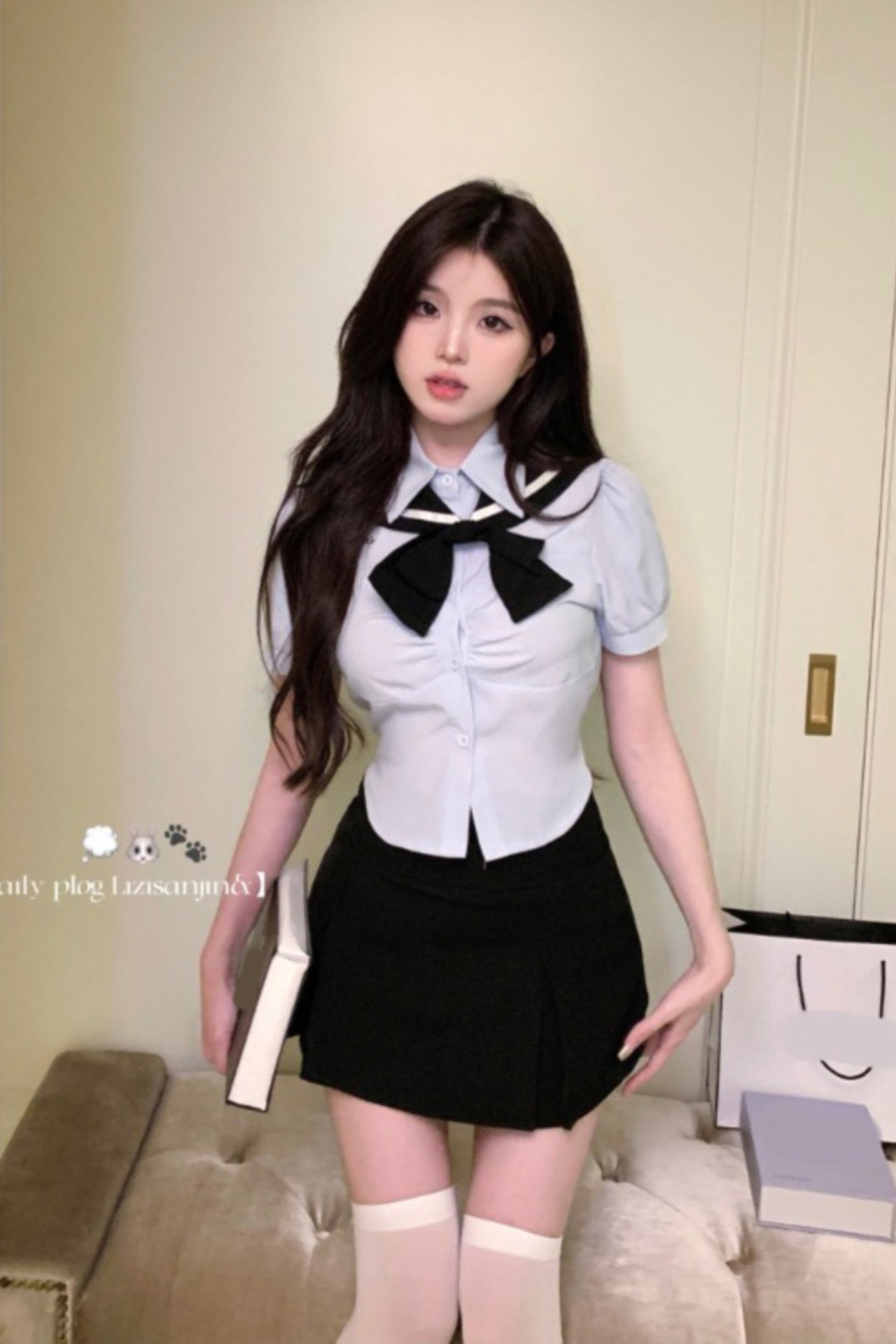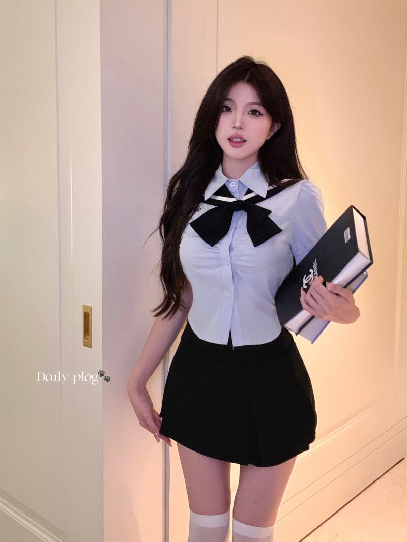甘いホットガールズスーツ夏弓ブラウスウエストスリムフィットスプリットヒップラップショートスカート 2 点セット服 リボン 大人ガーリー スウィート キュート カジュアル サマー 夏物