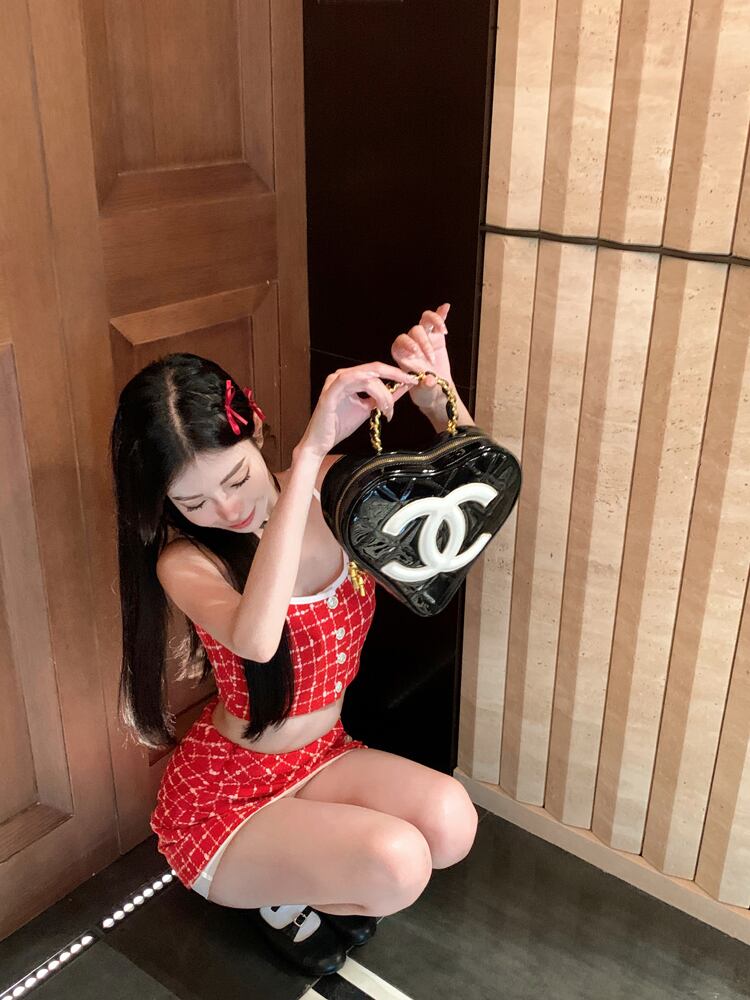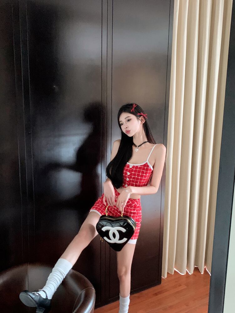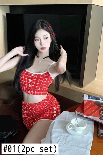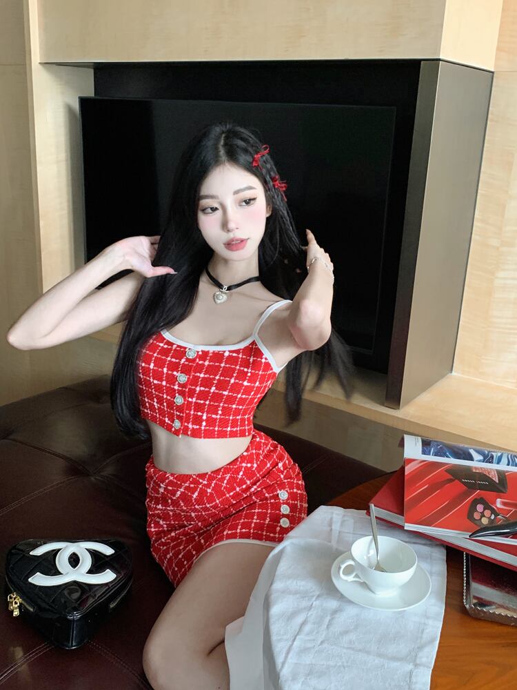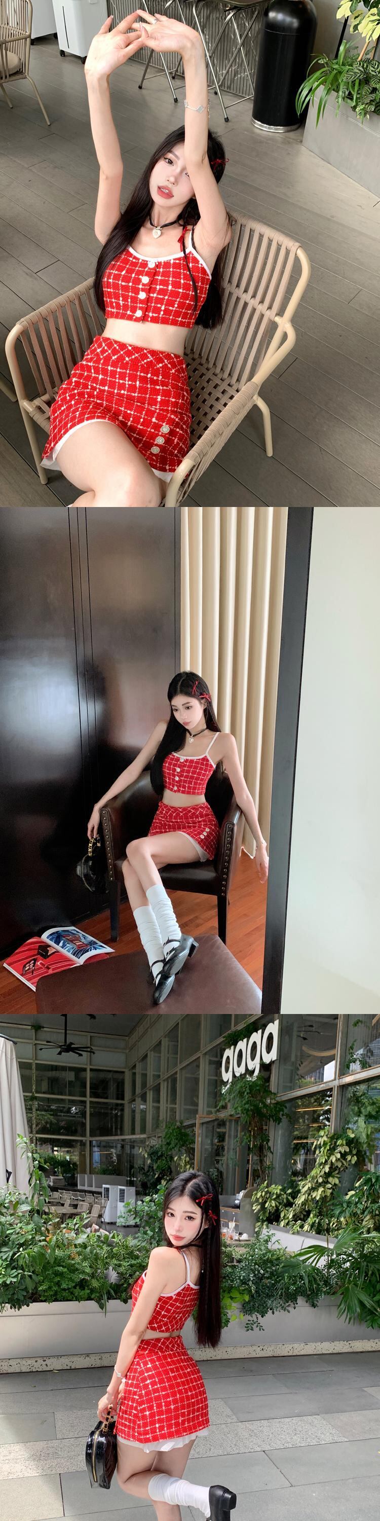 ホットガールチェック柄ニットスーツ夏スリムフィットキャミソール A ラインウエストスカート 2 点セット服 サマー 夏物 Aライン