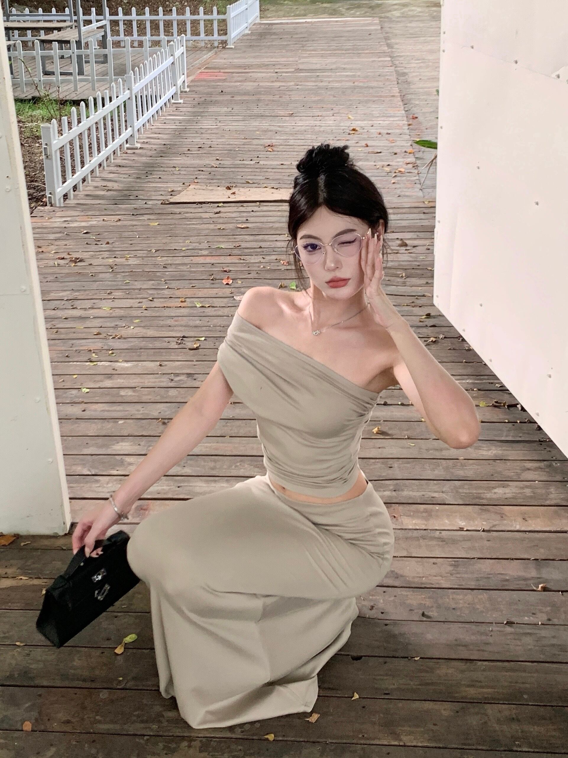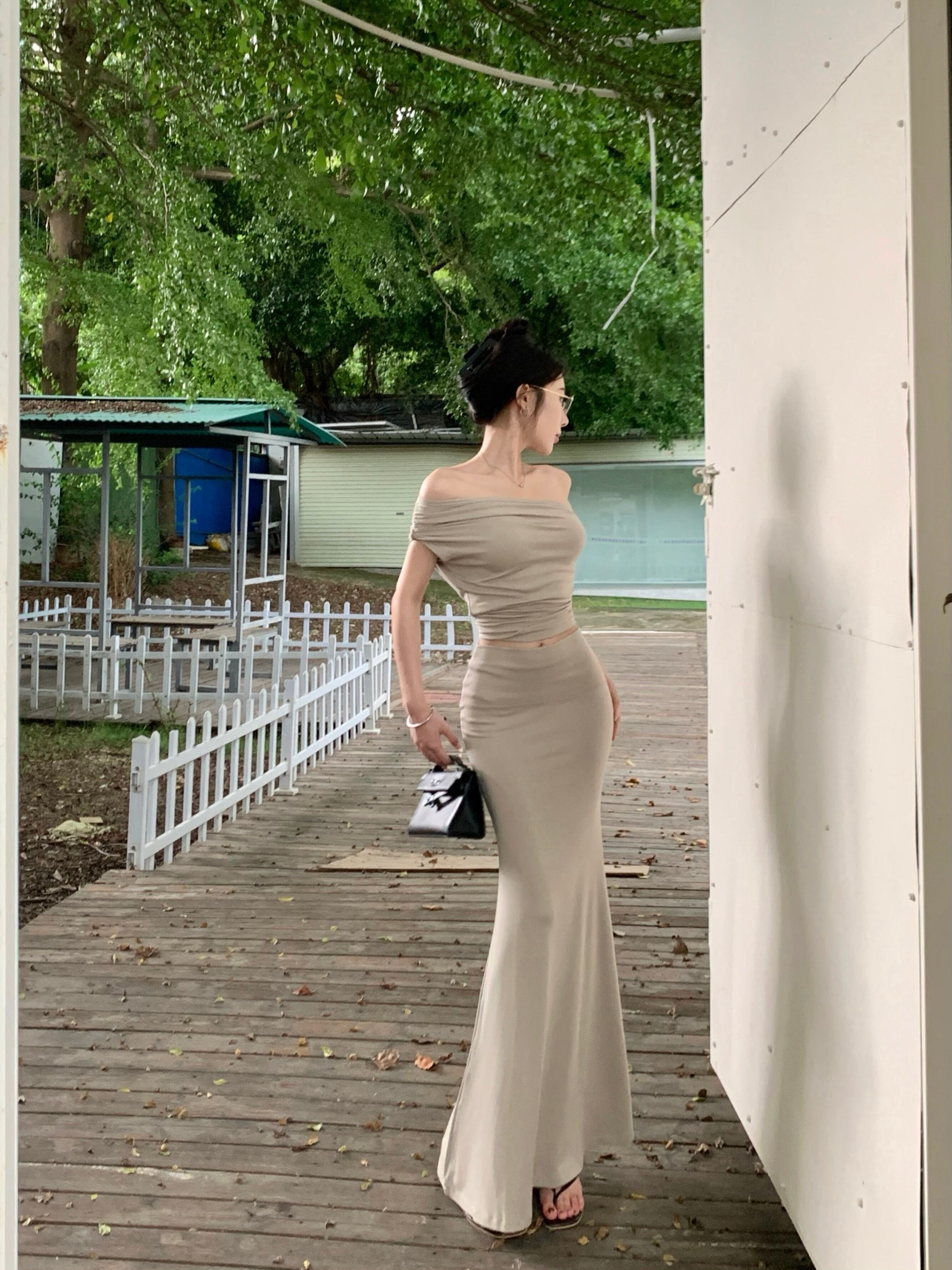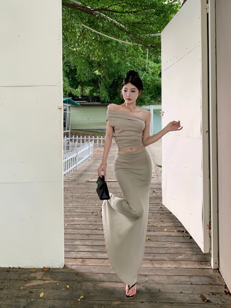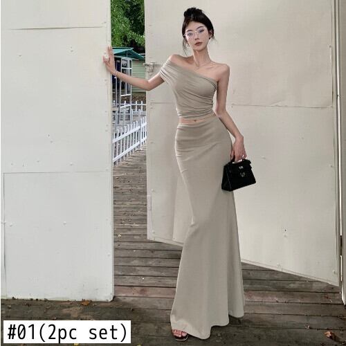 甘いホットガールスーツ夏傾斜肩スリムフィットトップマーメイドミッドレングススカートツーピースセット服 大人ガーリー スウィート キュート カジュアル サマー 夏物
