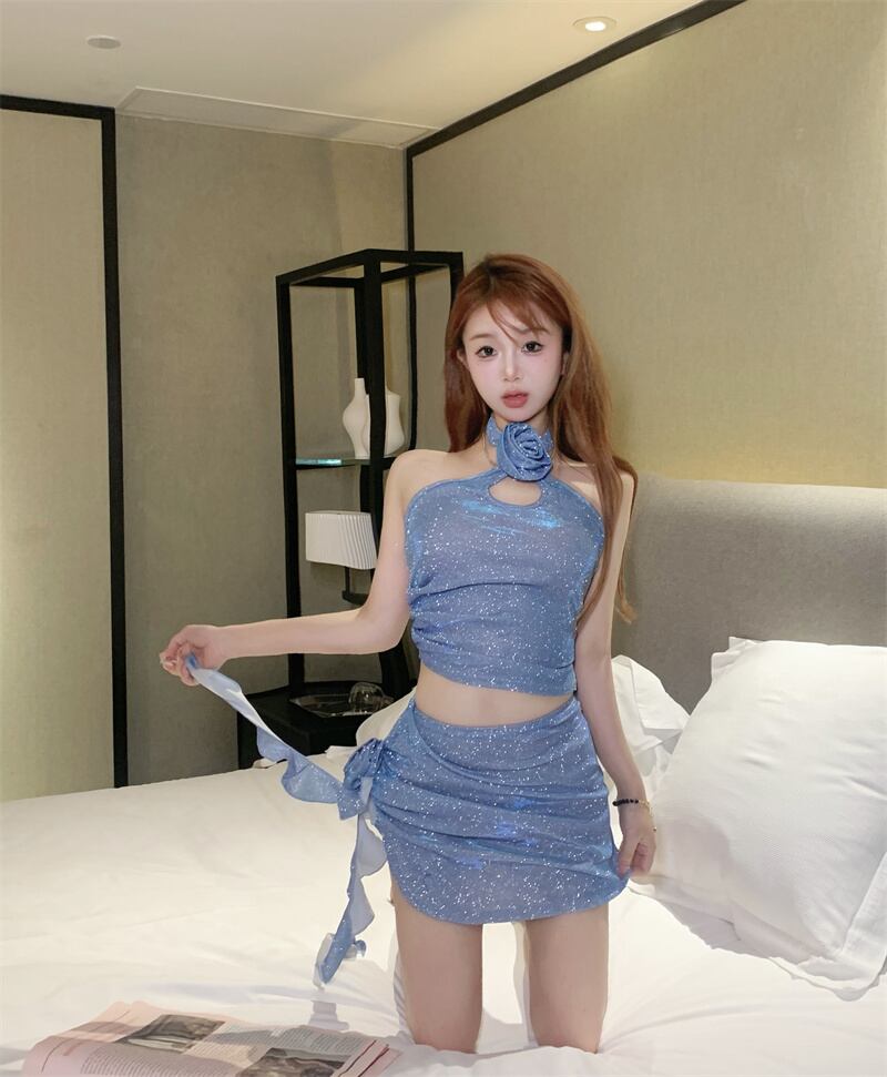 ホットガールスーツ夏中空アウトホルターネックキャミソールトップヒップラップショートスカートセクシーツーピースセット服 サマー 夏物