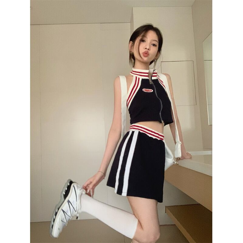 アメリカンホットガールズスポーツコントラストカラースーツ夏 O ネックタンクトップウエストショートスカート 2 点セット服 サマー 夏物 Oネック