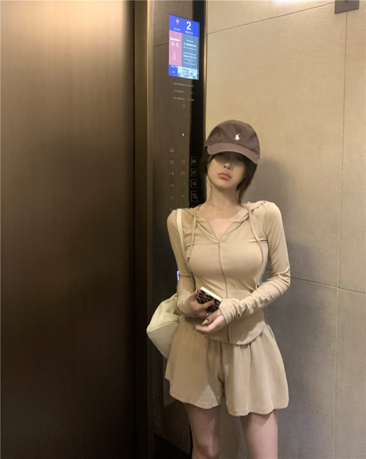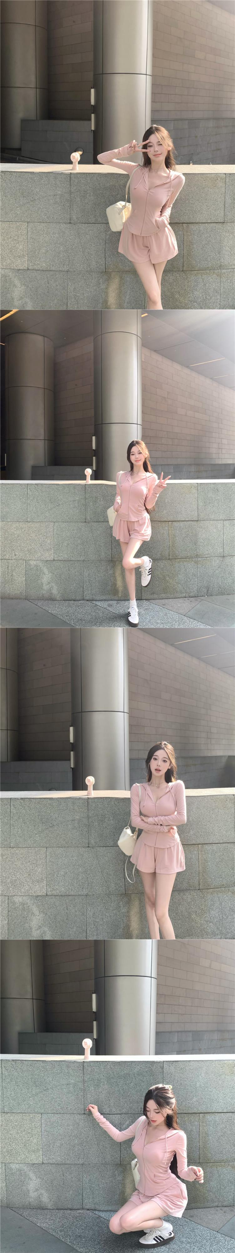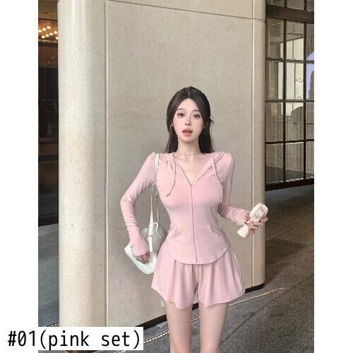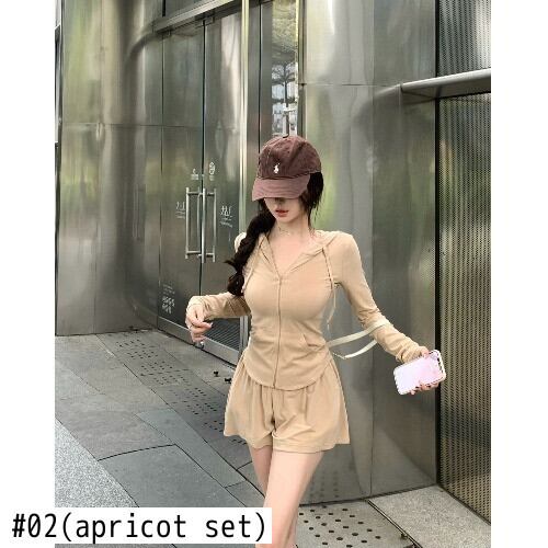 ホットガールスポーツ日焼け止めスーツ夏長袖フード付きジッパートップウエストショーツ 2 点セット ロング サマー 夏物 ブルマー
