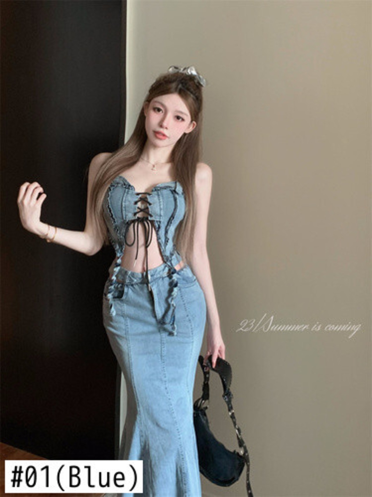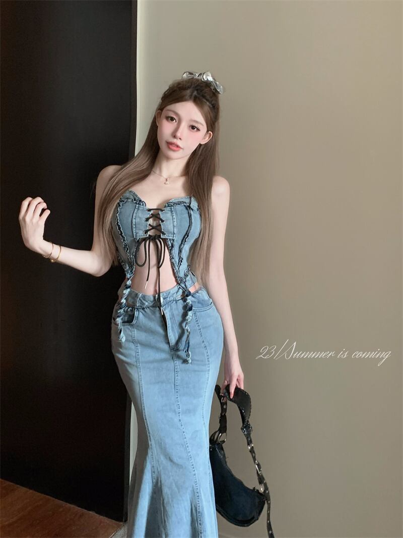 甘いホットガールレトロスーツ夏ノースリーブショートトップマーメイドラップヒップロングスカートツーピースセット服 大人ガーリー スウィート キュート カジュアル サマー 夏物