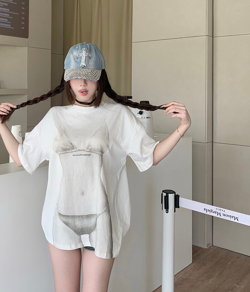 アメリカンホットガールスタイルビキニプリントトップス遠近効果ルーズフィット夏スリム多用途半袖Tシャツ サマー 夏物