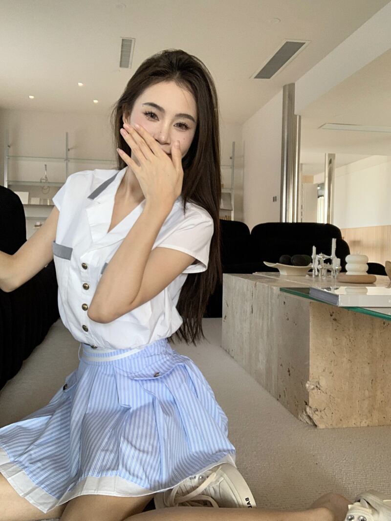 スイートガールスタイルスーツ レディース 夏 半袖 ターンダウンカラーシャツ ウエスト Aライン プリーツスカート 2点セット 大人ガーリー スウィート キュート カジュアル サマー 夏物