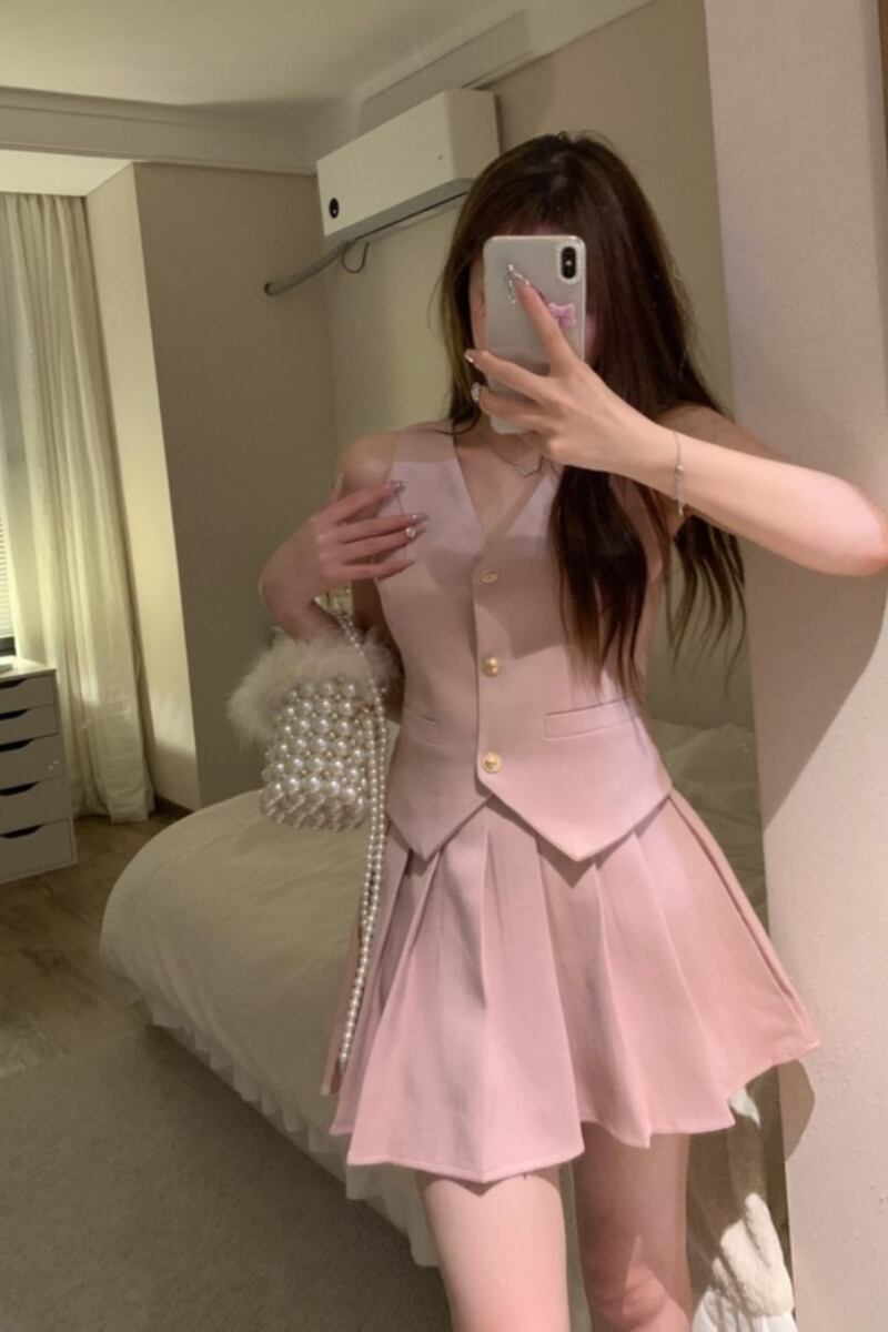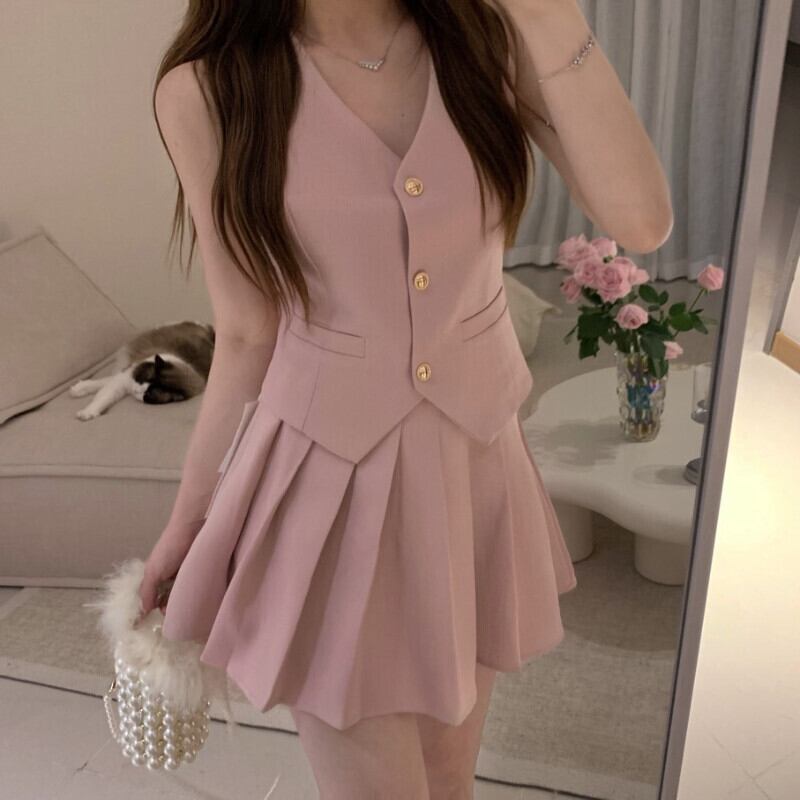 スイートガールスーツ夏 V ネックノースリーブスリムベストプリーツウエストミニスカート 2 点セット服 大人ガーリー スウィート キュート カジュアル サマー 夏物 Vネック