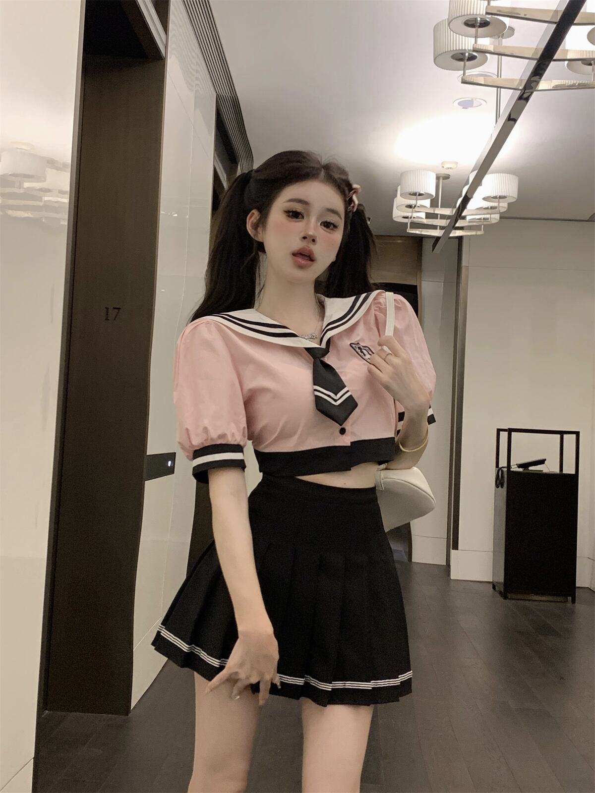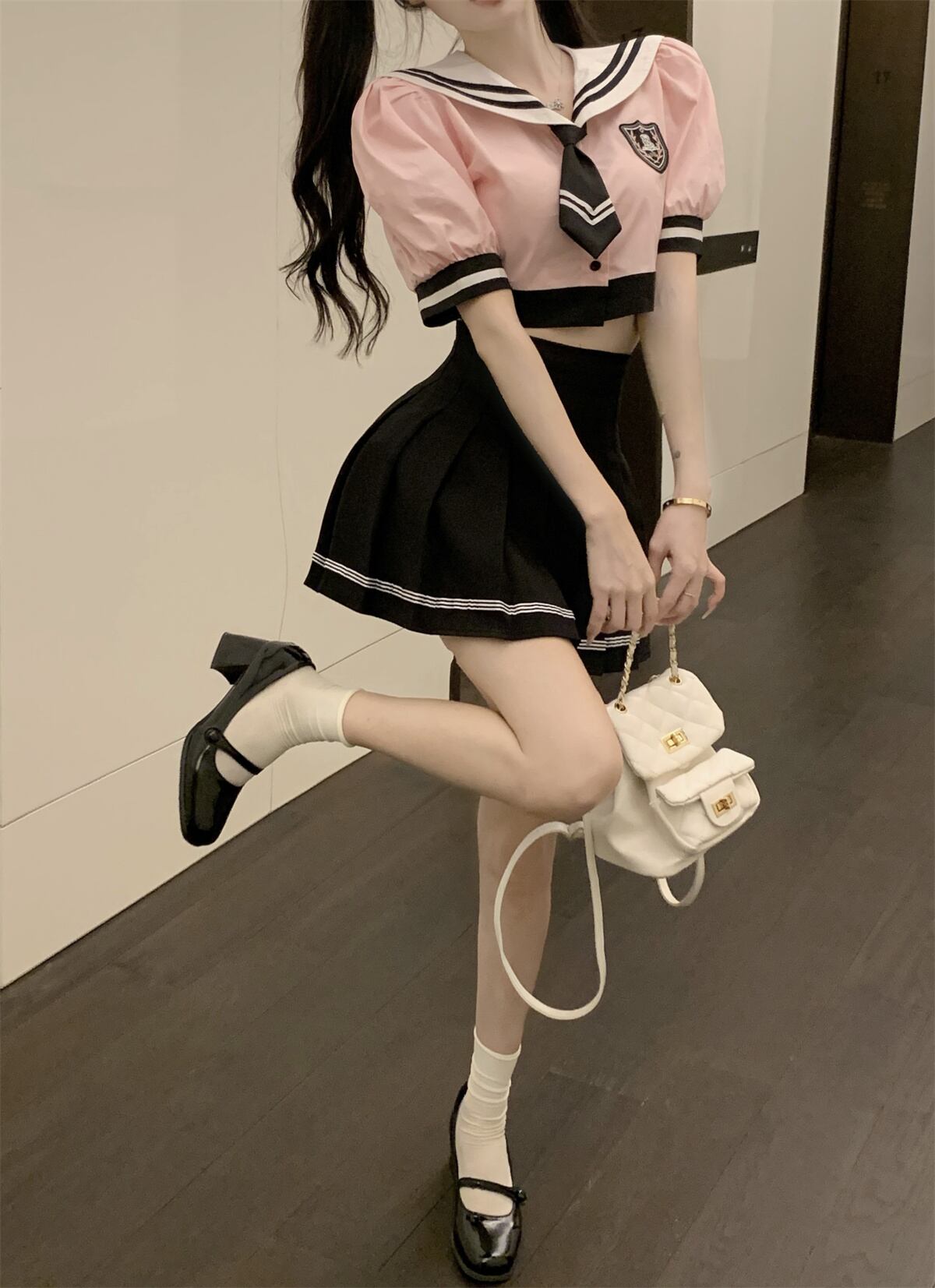 アカデミースタイルスーツ レディース ゆったり セーラー襟 トップ ウエスト プリーツ スカート 2点セット 服