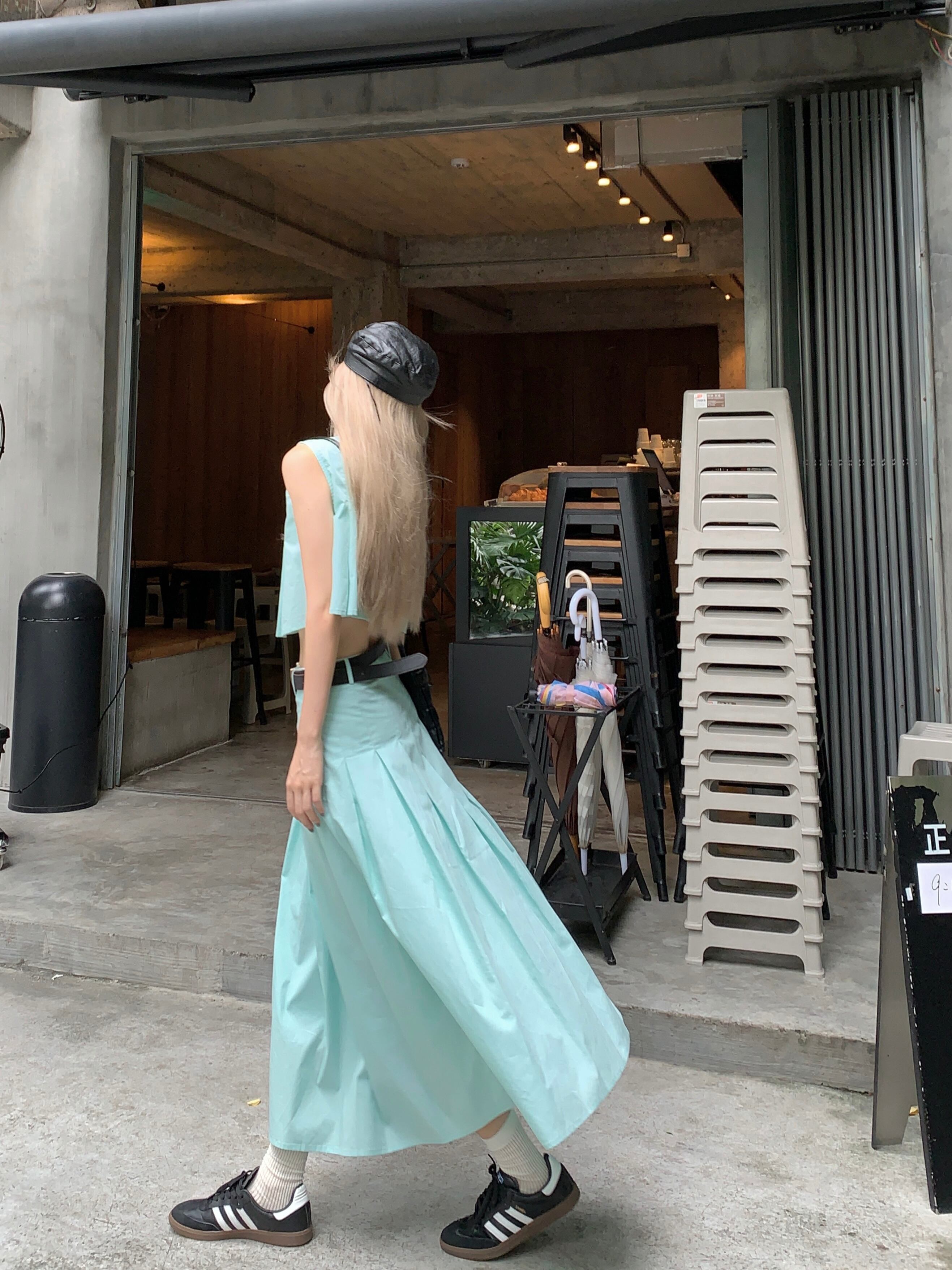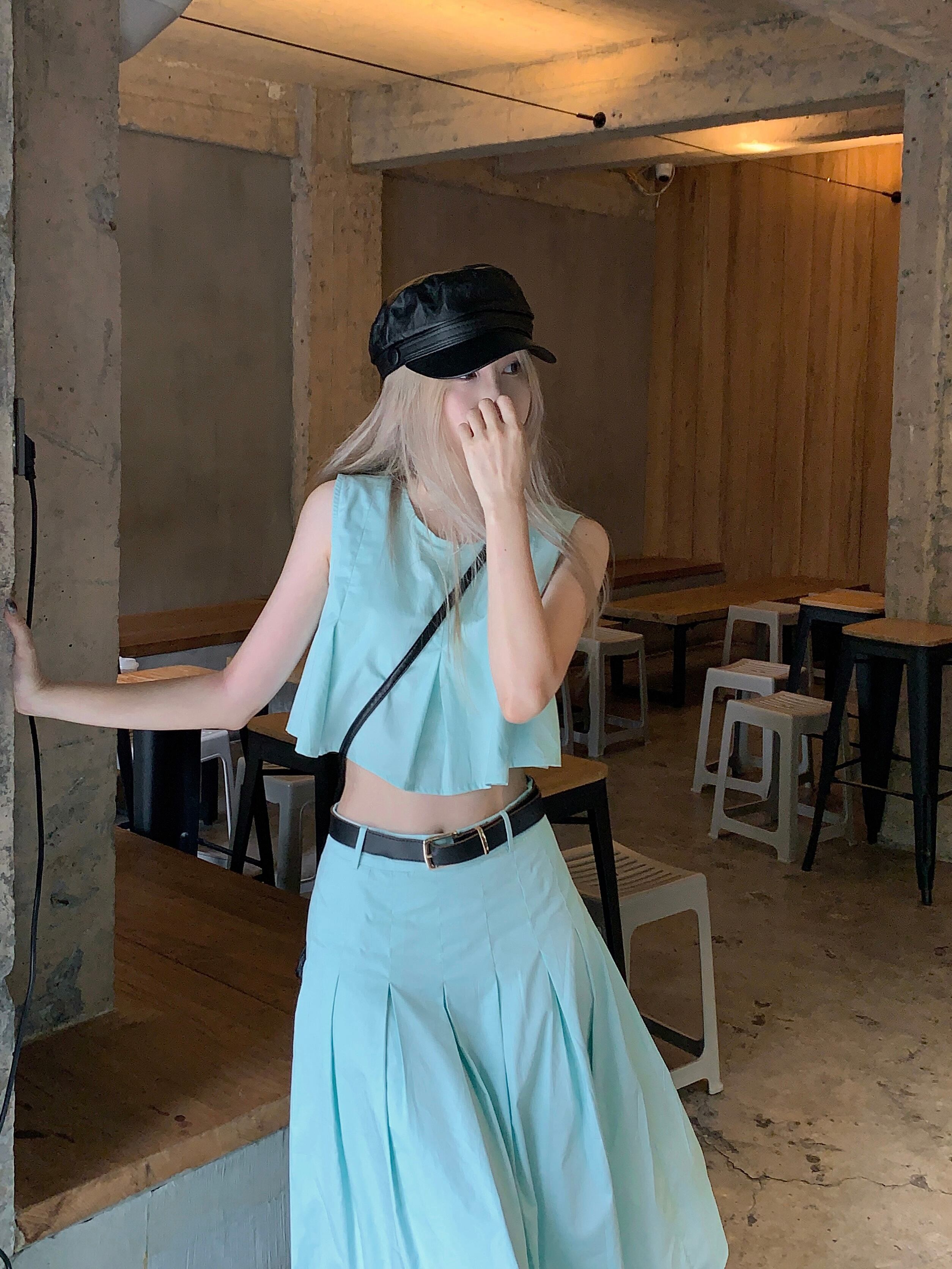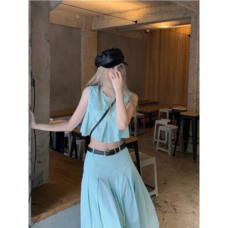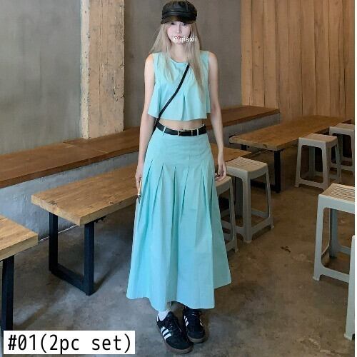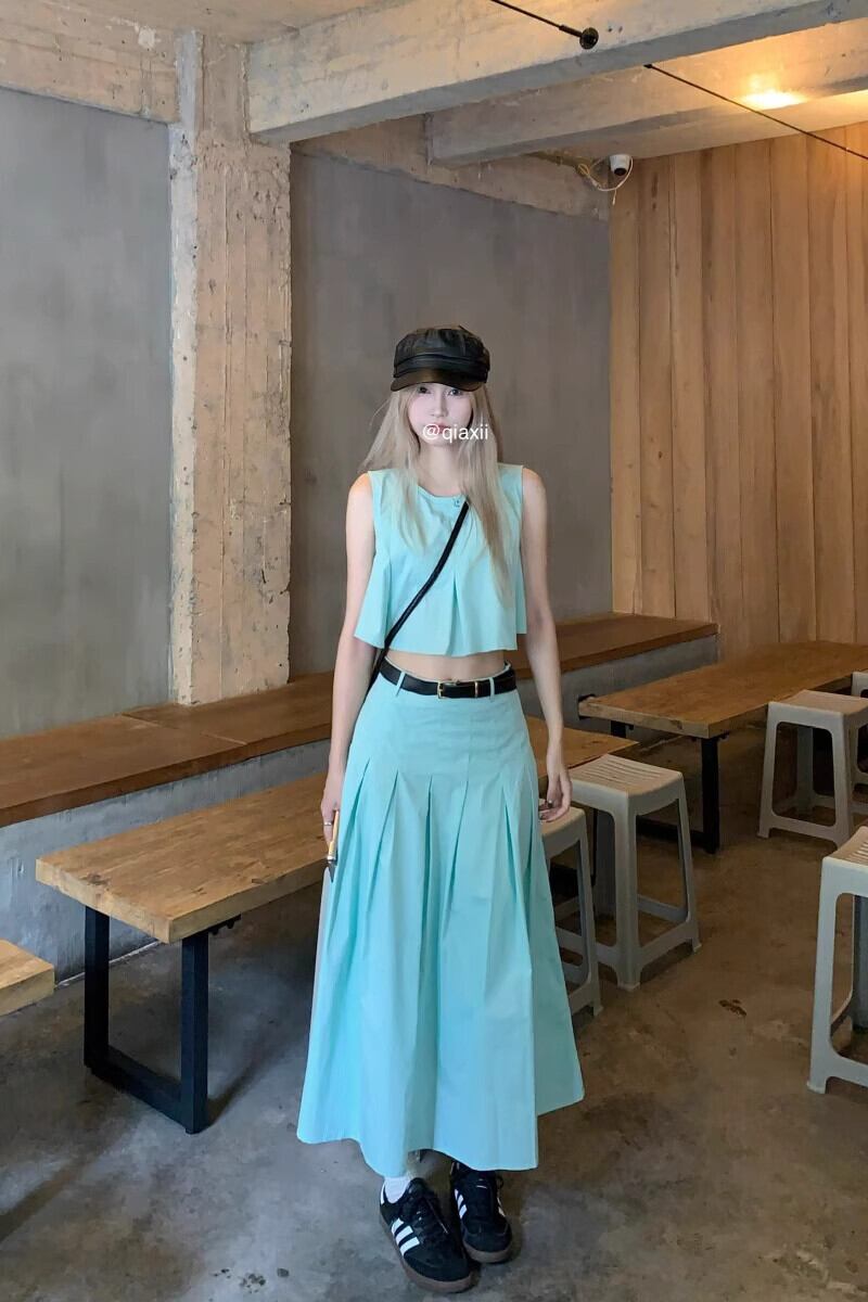 ミニマリスト グリーン スーツ レディース 夏 ノースリーブ プリーツ タンクトップ ミディアム丈 スカート 2点セット 服 サマー 夏物