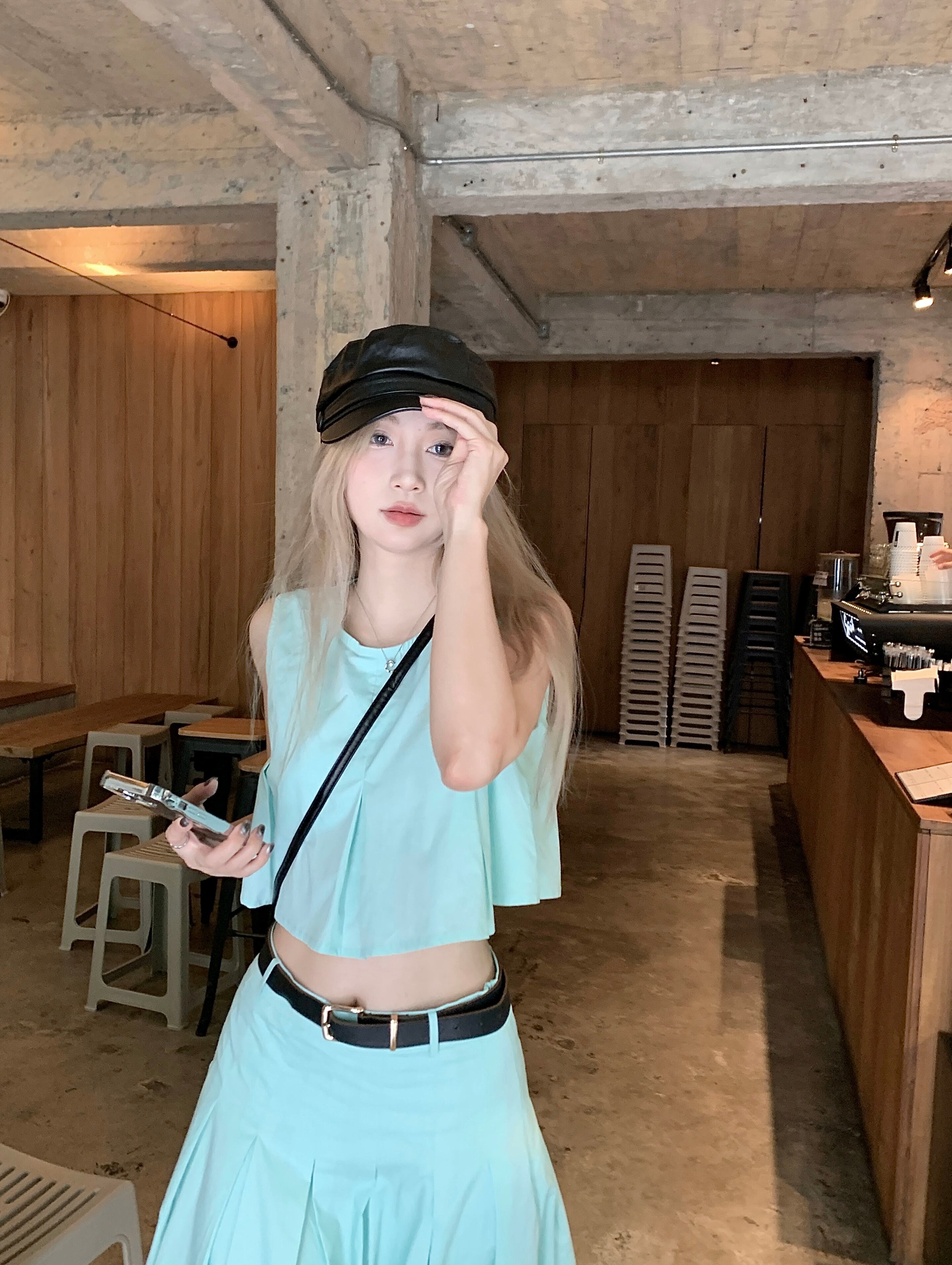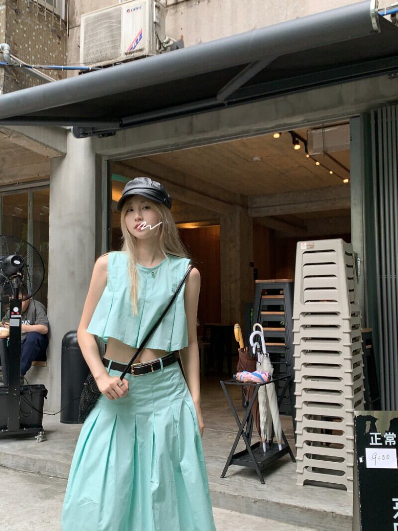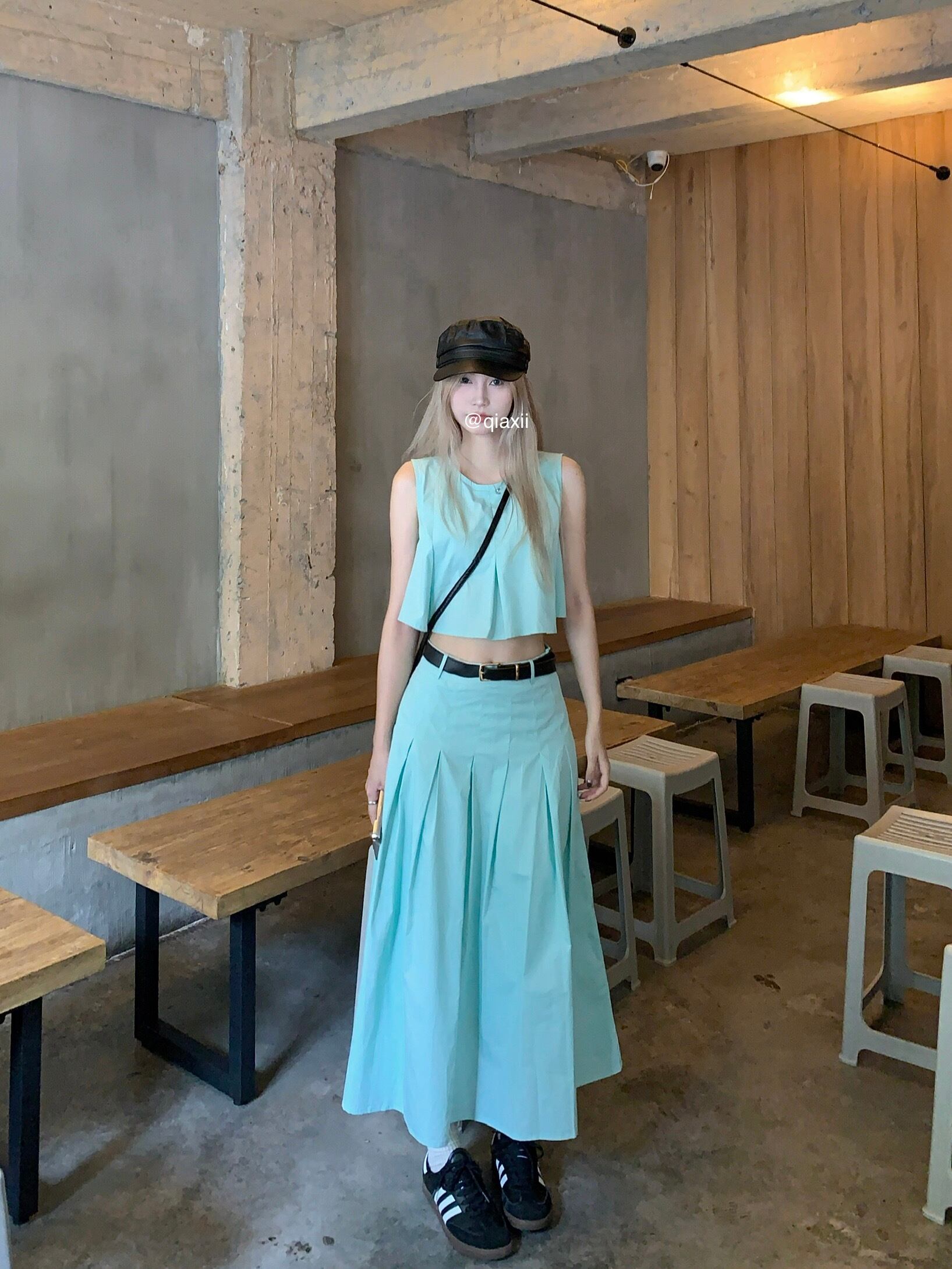 ミニマリスト グリーン スーツ レディース 夏 ノースリーブ プリーツ タンクトップ ミディアム丈 スカート 2点セット 服 サマー 夏物