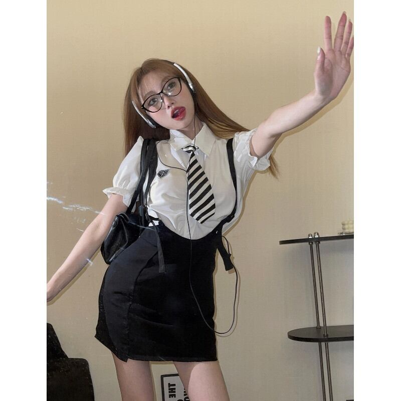 フレンチ プレッピー スタイル スーツ レディース ターンダウンカラー バブル スリーブ シャツ ストラップ A ライン ドレス 2 点セット 服 Aライン