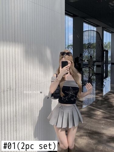 甘いホットガールスーツ夏コントラストオフショルダー Tシャツトッププリーツショートスカート 2 点セット服 大人ガーリー スウィート キュート カジュアル サマー 夏物