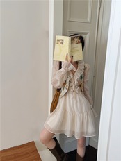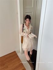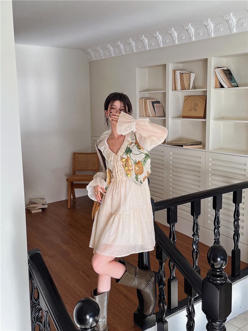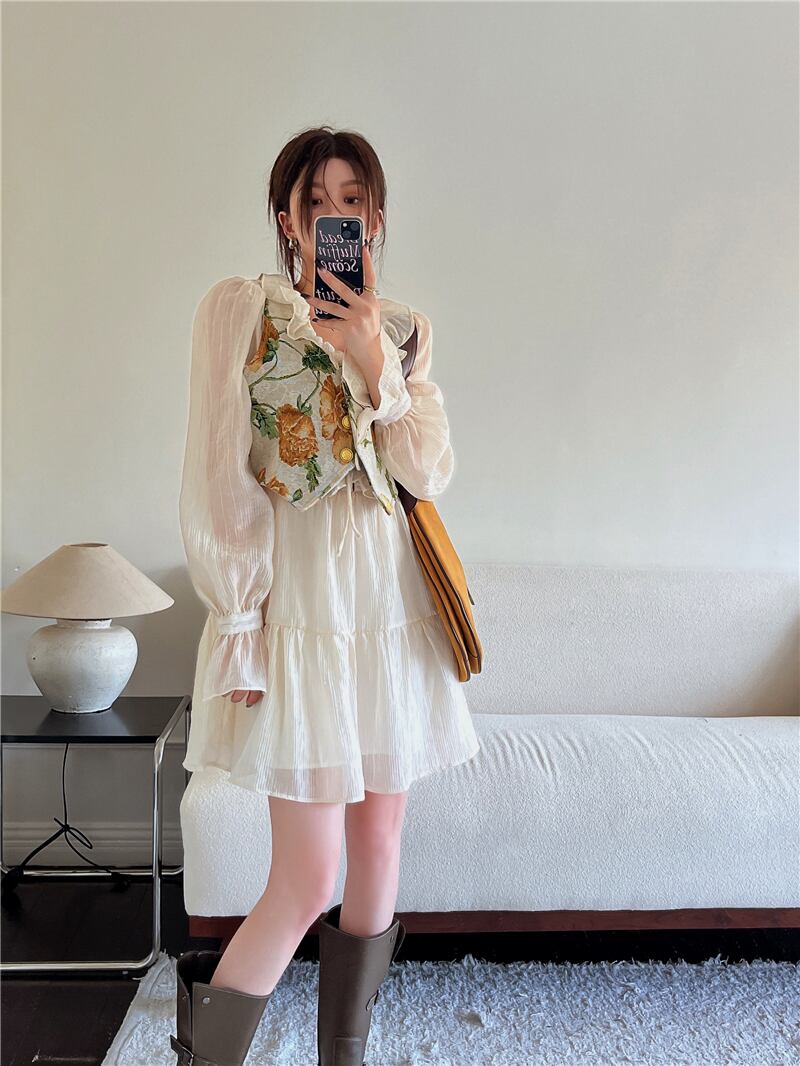 フレンチスウィートガールスーツ レディース 秋花刺繍ベスト タンクトップ レースアップショートドレス ツーピースセット服 レッド 大人ガーリー キュート カジュアル オータム 秋物 フラワーデザイン