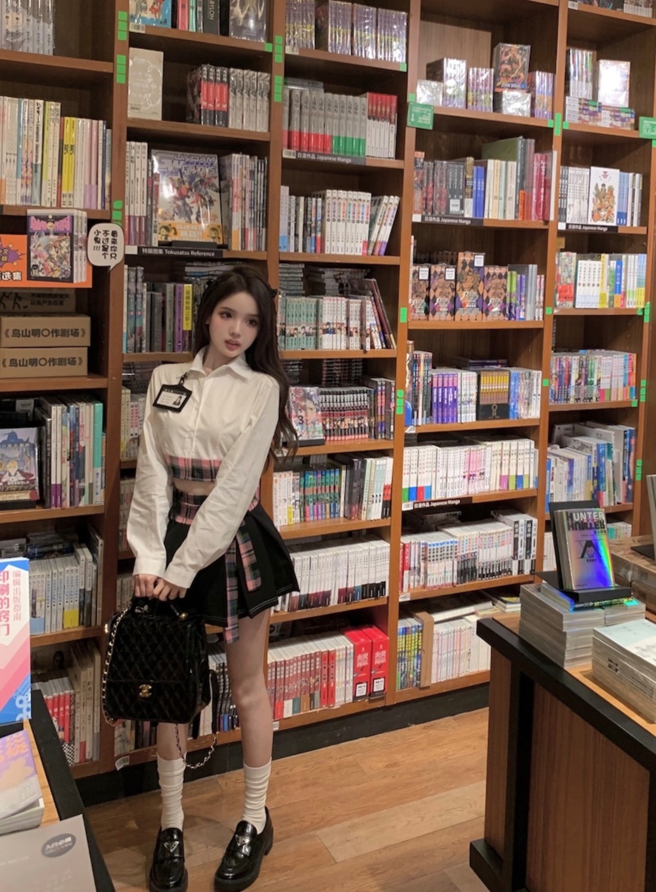 スタイルスーツ秋スリムフィットチェック柄パッチワークシャツウエストショートスカートツーピースセット服 オータム 秋物