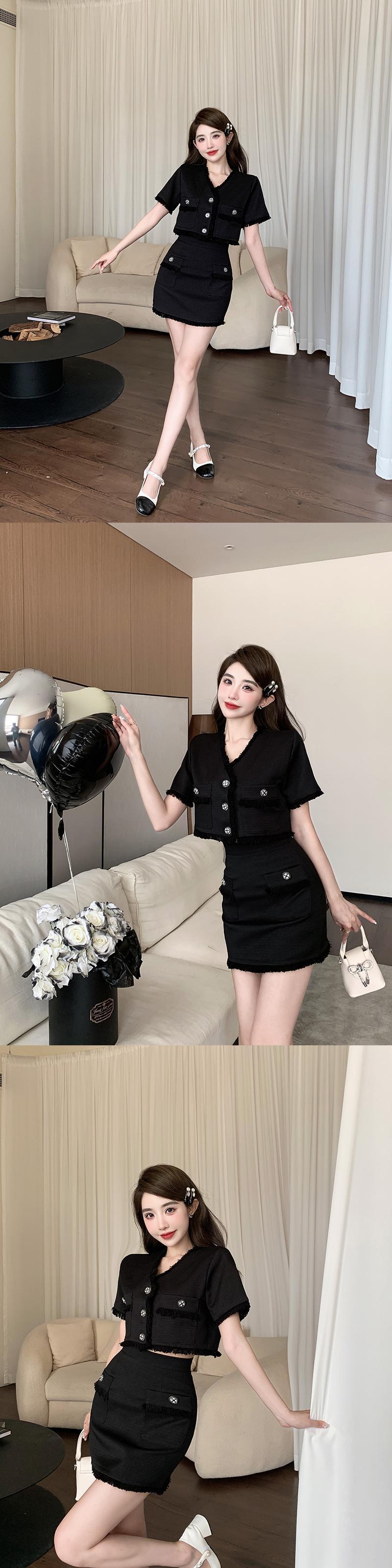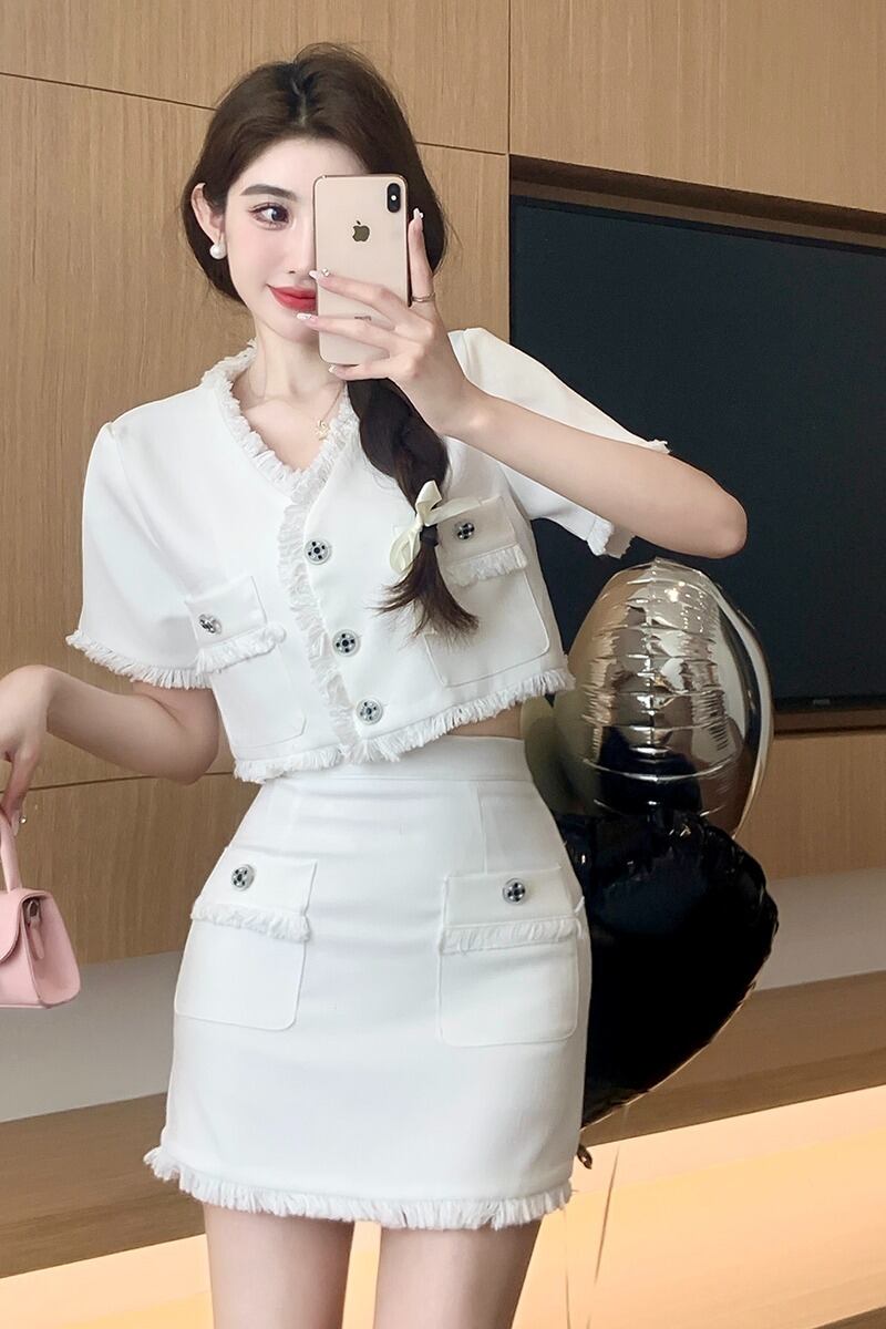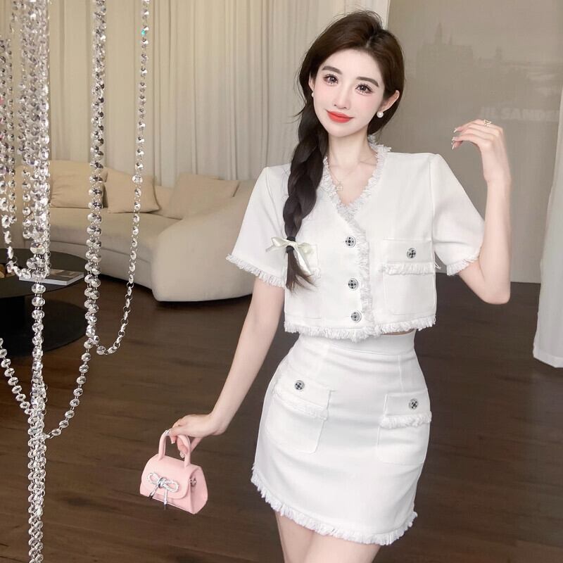 フレンチスイートガールスーツ レディース 夏 テル Vネック 半袖 トップ ウエスト Aライン ミニスカート ツーピースセット服 大人ガーリー スウィート キュート カジュアル サマー 夏物