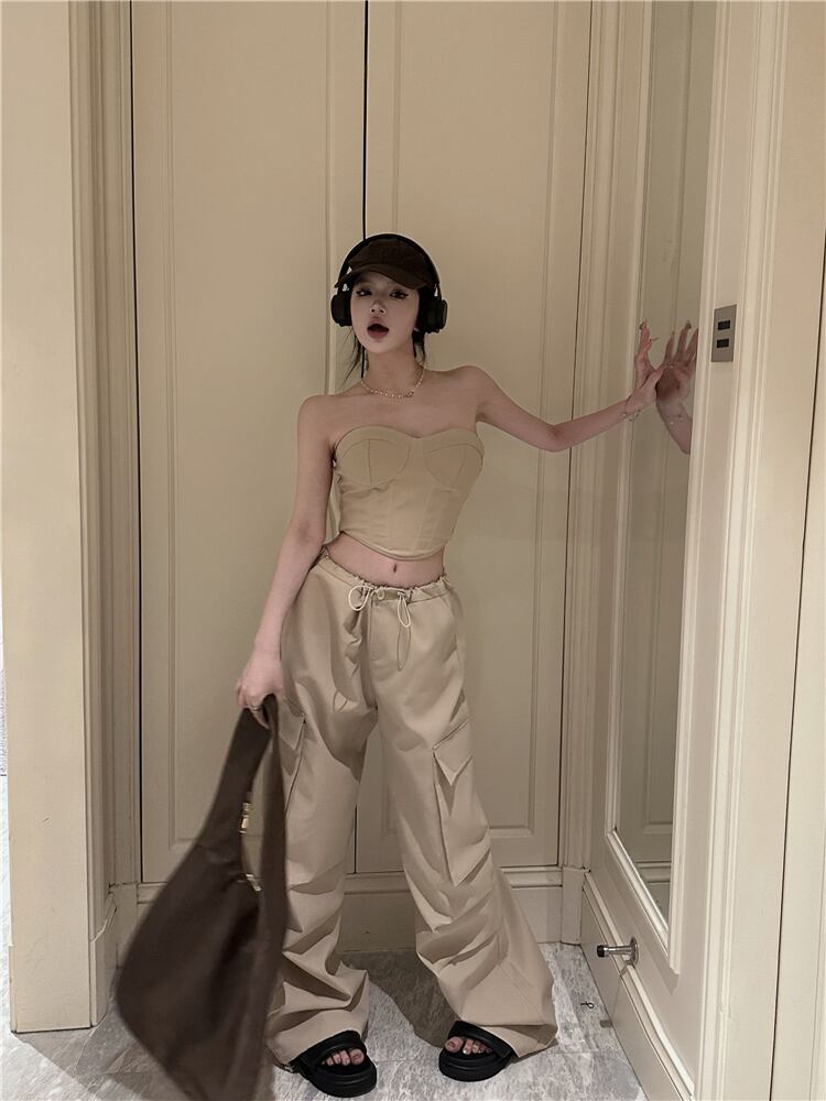 アメリカンレトロ甘いホットガールスーツ夏セクシーストラップレストップウエストワイドレッグカーゴパンツ可能ツーピースセット 大人ガーリー スウィート キュート カジュアル サマー 夏物 ワイドパンツ