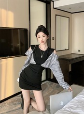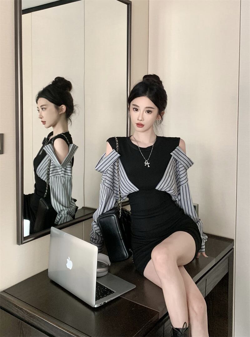 スパイシーガールズショー薄い偽ツーピースシャツオフショルダードレスラップヒップショートドレス秋ストライプ服 オータム 秋物