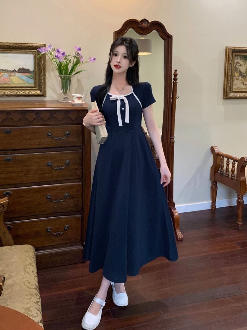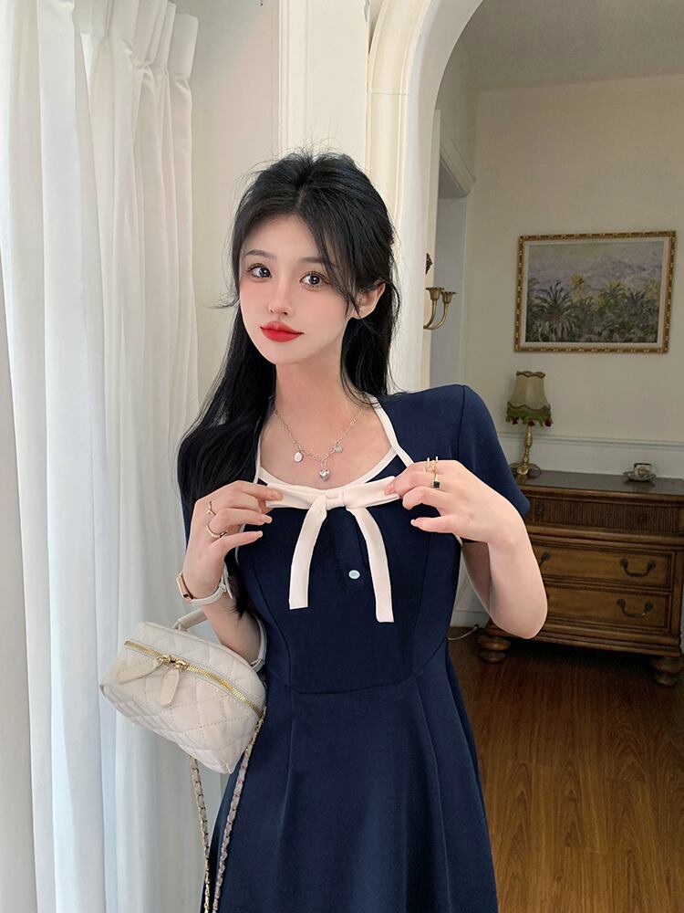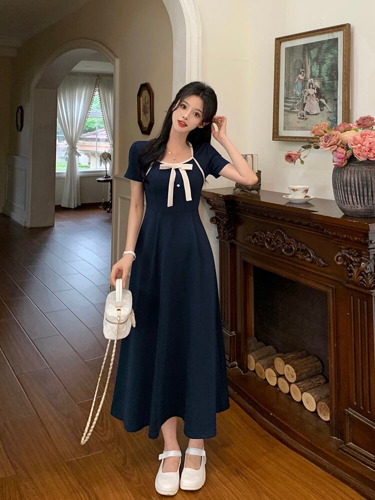 甘いホットガールプレッピースタイル弓スリムフィットロングドレス秋スクエアカラー半袖ドレス服 リボン 大人ガーリー スウィート キュート カジュアル オータム 秋物 スクウェア