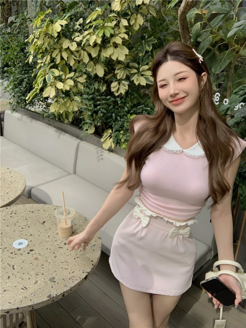 フレンチホットガールスーツ夏ポロネックスリムフィットニット半袖トップ蝶レースピンクミニスカートツーピースセット サマー 夏物 Oネック