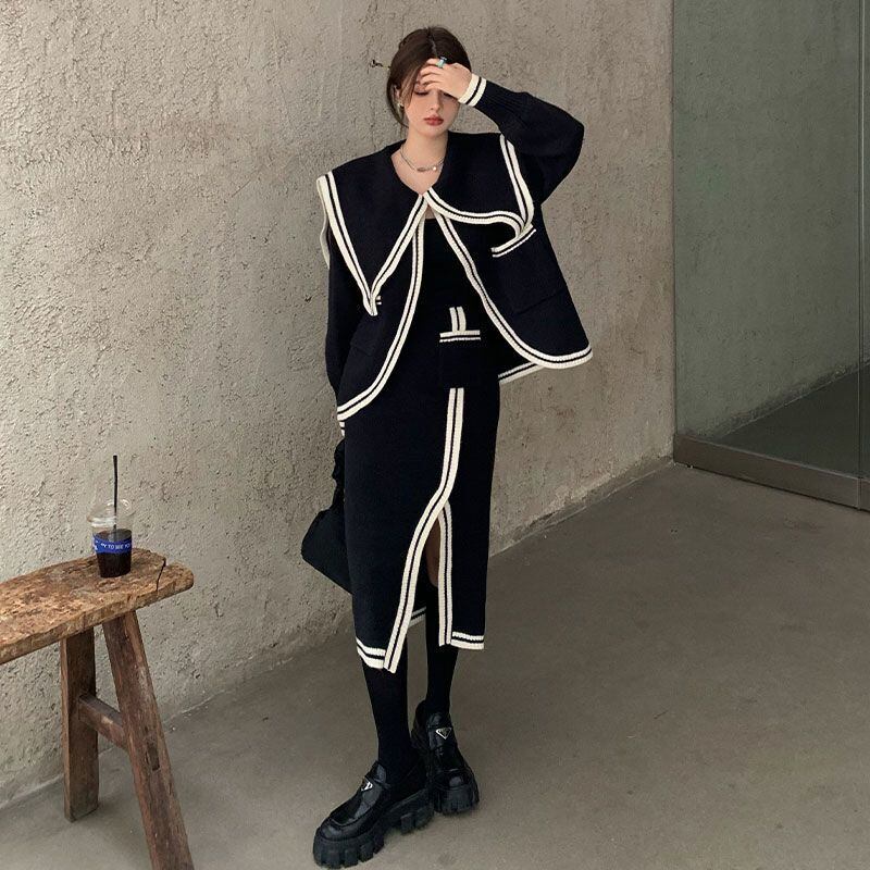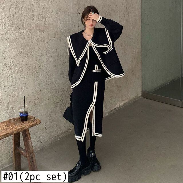 オフィスレディ スーツ レディース 秋冬 コントラストカラー カーディガン トップス ウエスト分割 ロングスカート 2点セット オータム 秋物 ウィンター 冬物 会社 学校 通勤や通学にも
