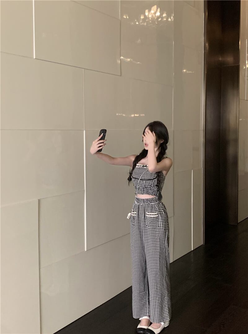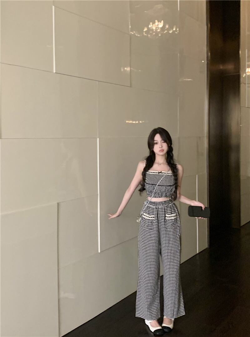 ホットガール黒と白チェッカースーツ夏キャミソールトップウエストパンツツーピースセット服 ホワイト ブラック サマー 夏物