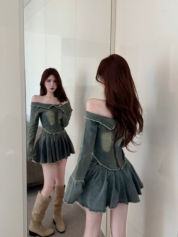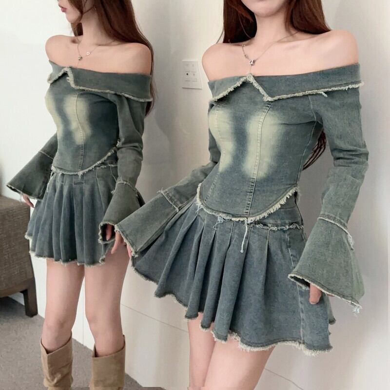 アメリカン ホット ガールズ スーツ レディース 夏 オフショルダー ラグド フレア スリーブ デニム トップ プリーツ スカート スリム フィット 2 点セット フレアスリーブ サマー 夏物