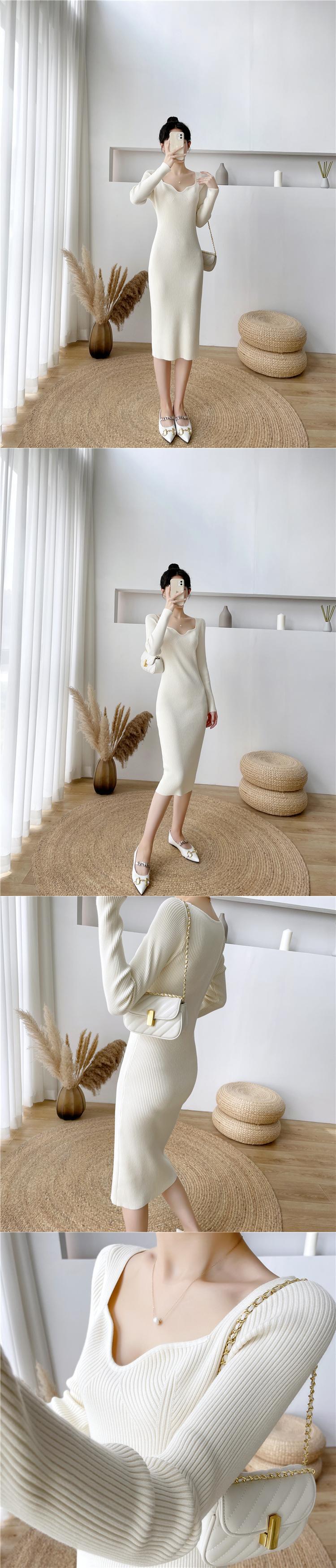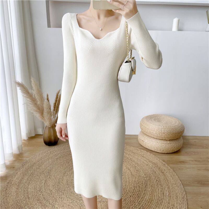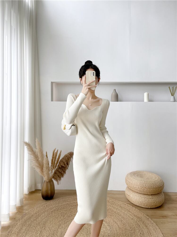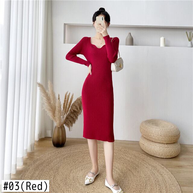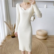フレンチスタイル膝丈ウールドレス秋と冬長袖セクシーラップヒップニットドレス服 ロング オータム 秋物 ウィンター 冬物