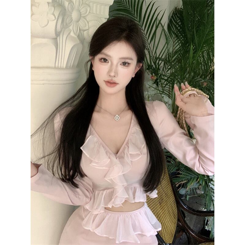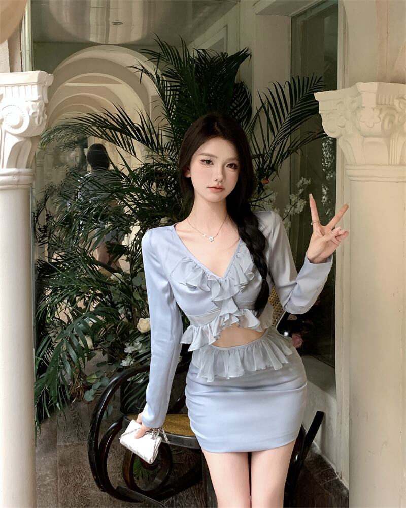 スタイルスーツ秋スリムフィット V ネックピンクブルートップウエストミニスカート 2 点セット服 オータム 秋物 Vネック