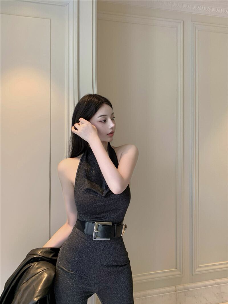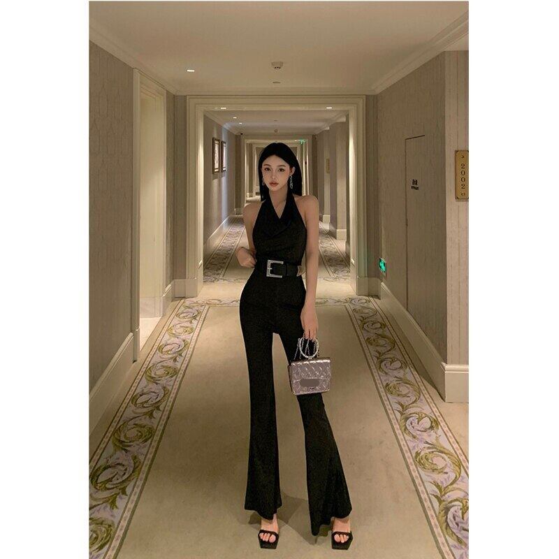 ホットガールセクシーホルターネックオープンバックジャンプスーツ秋フレンチパンツベルトツーピースセット服 オータム 秋物 ハーネス