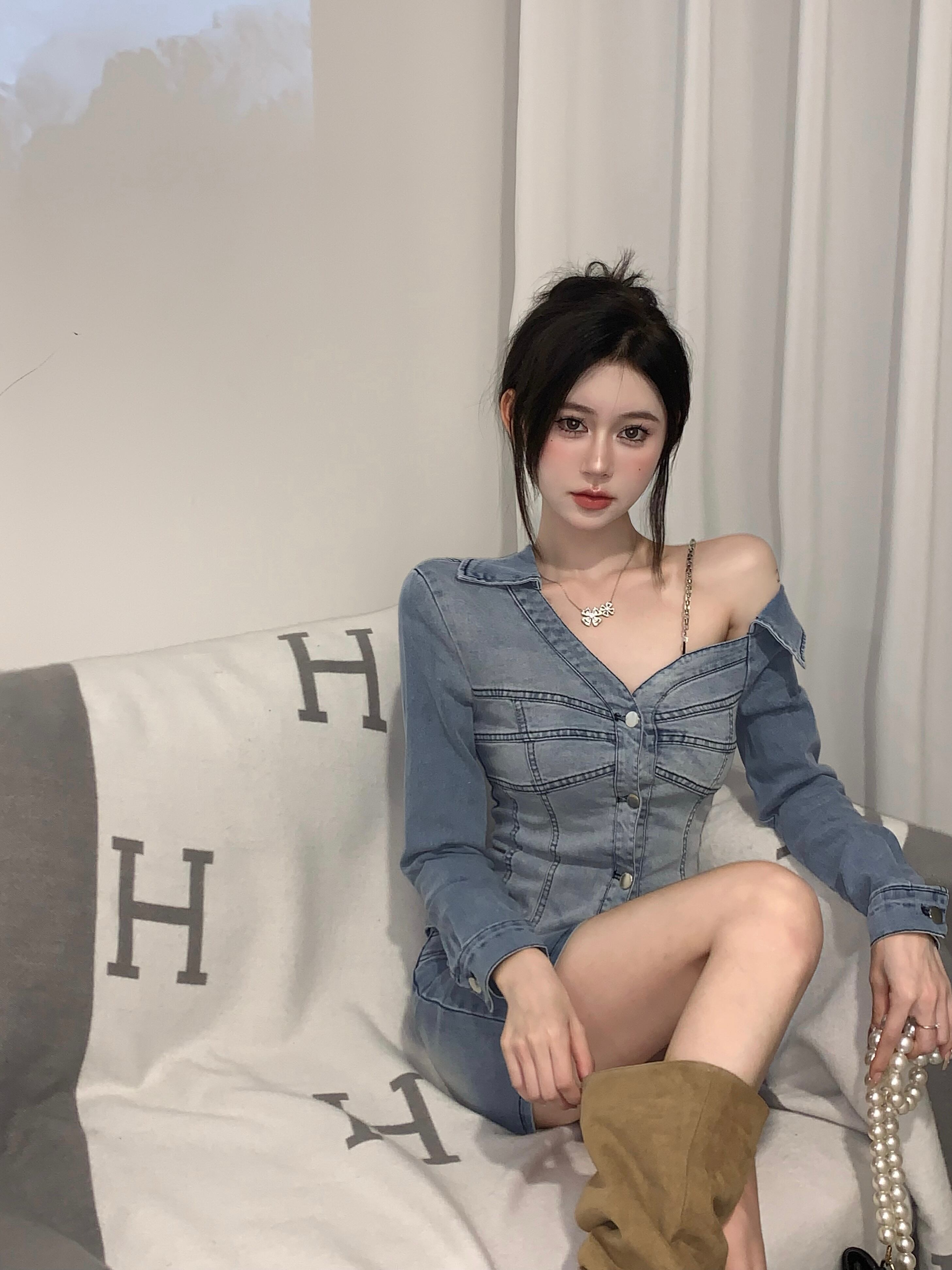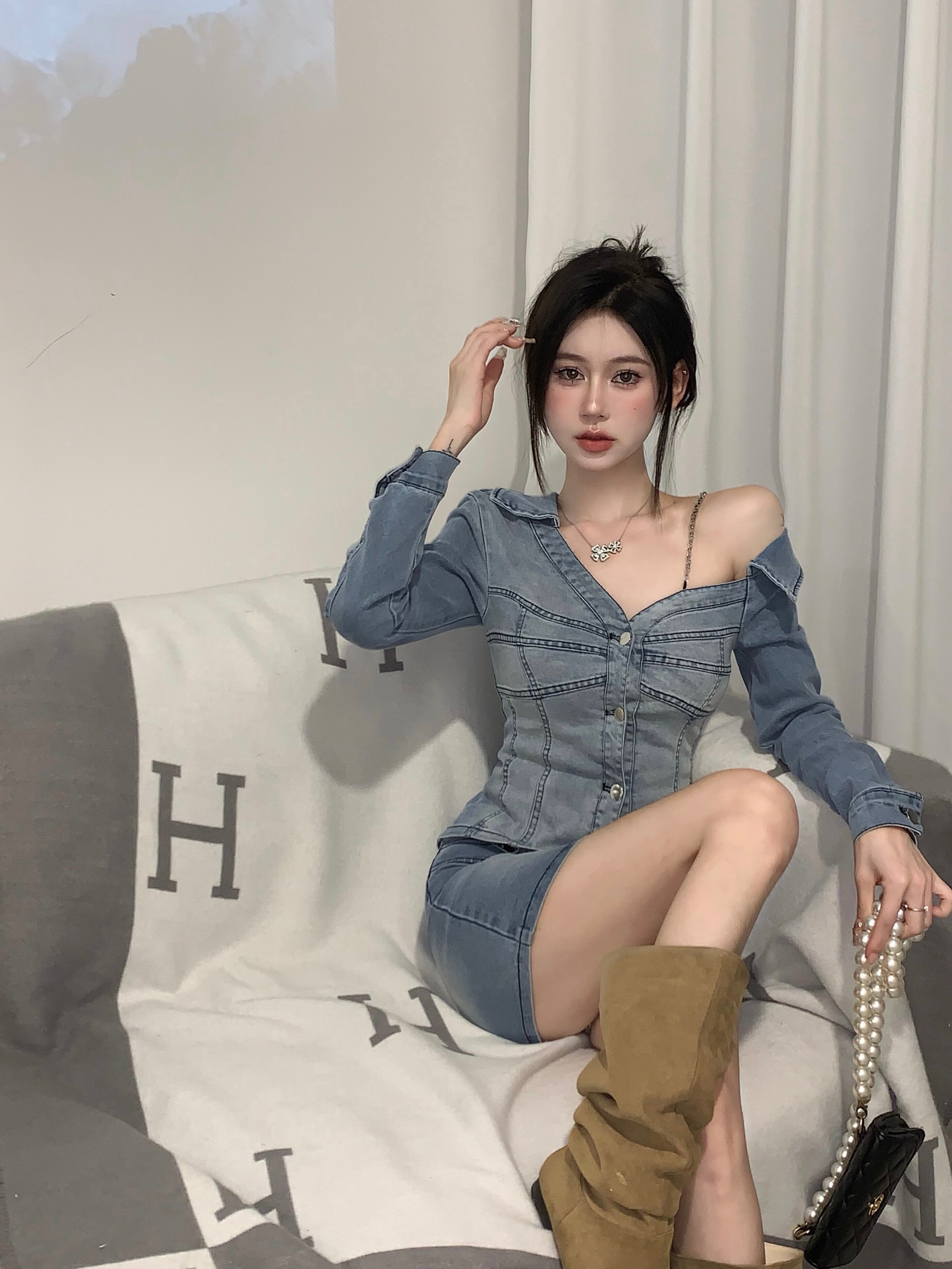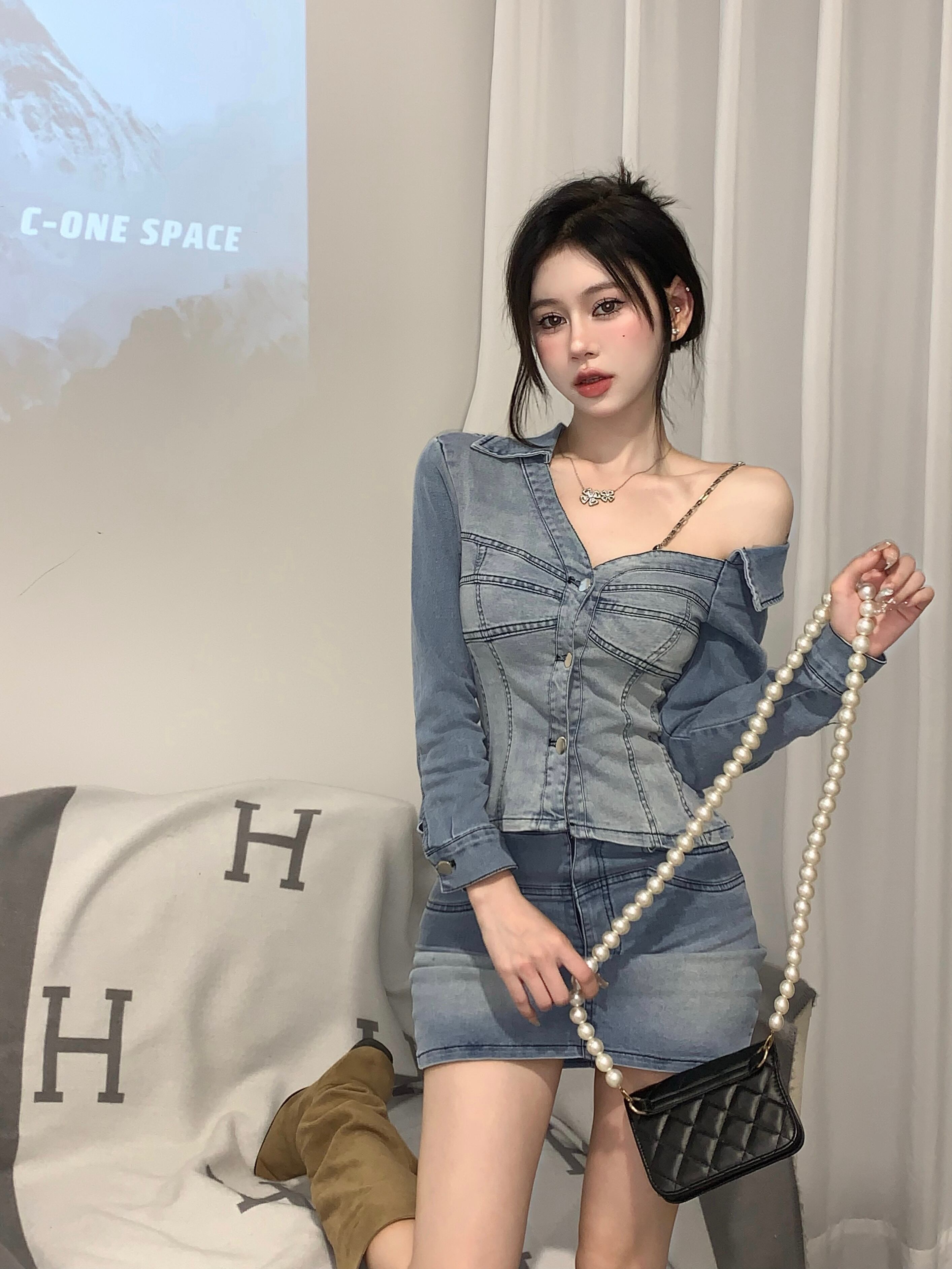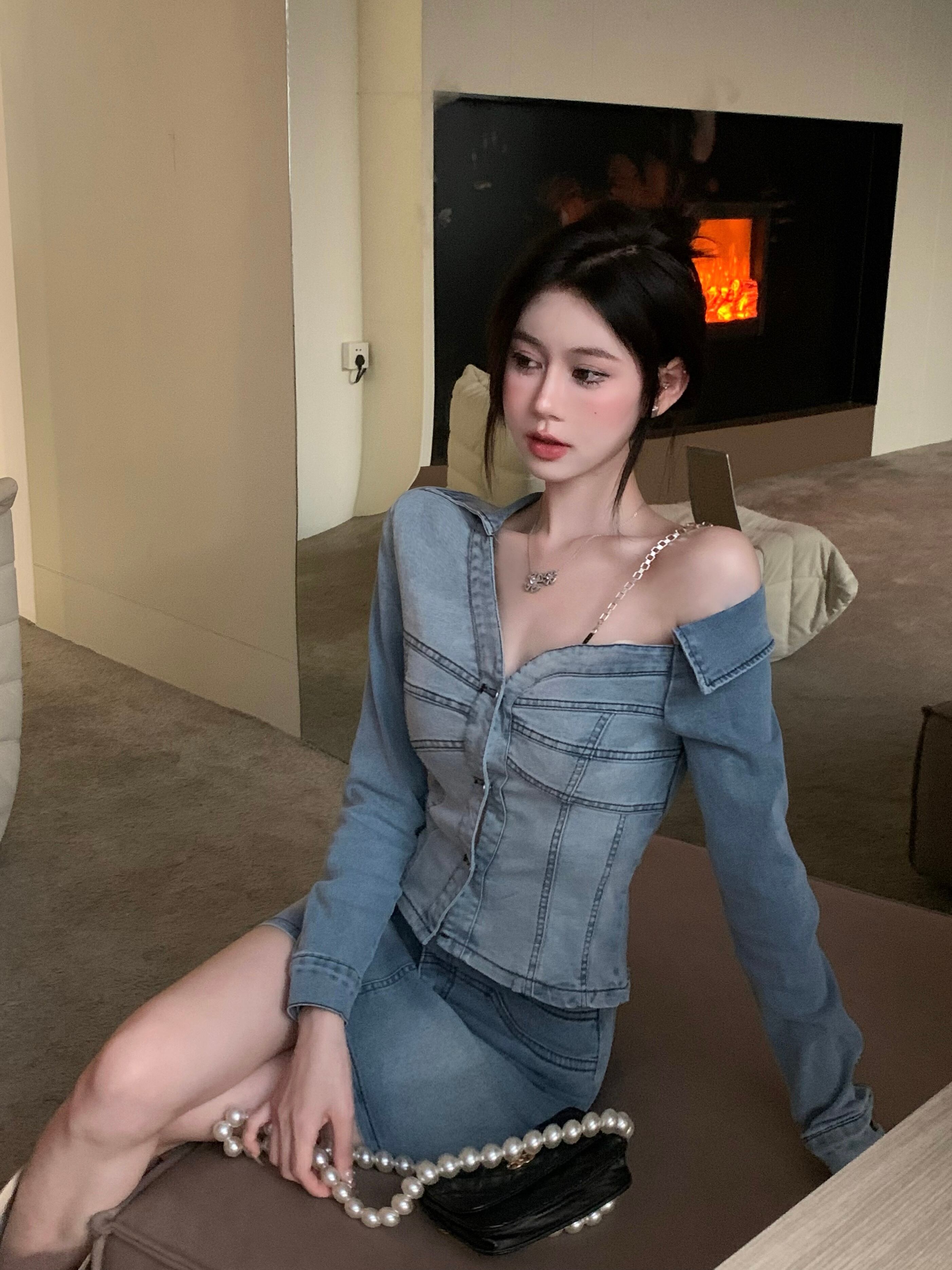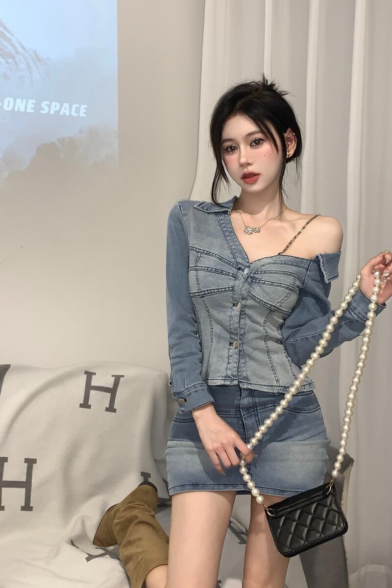 レトロスーツ夏不規則デニム長袖コートトップラップヒップショートスカートツーピースセット服 ロング サマー 夏物