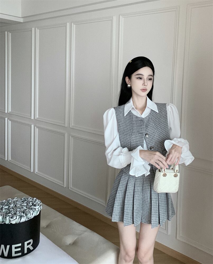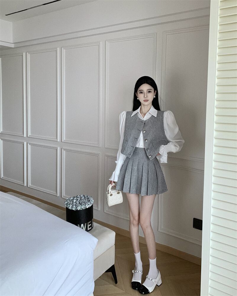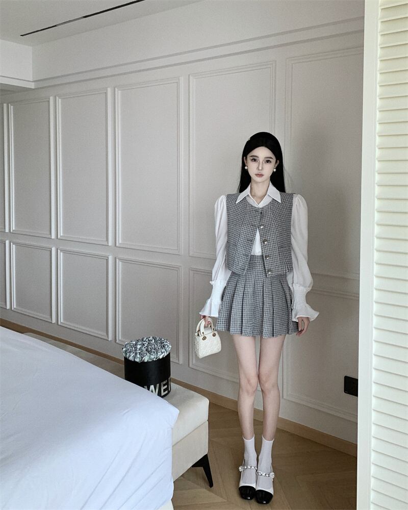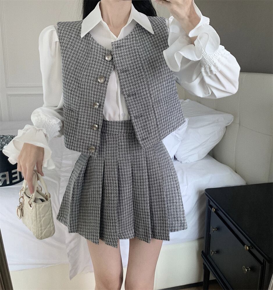 スイートガールスーツ秋ベストトップウエストプリーツミニスカート白シャツ 3 点セット服 ホワイト 大人ガーリー スウィート キュート カジュアル オータム 秋物