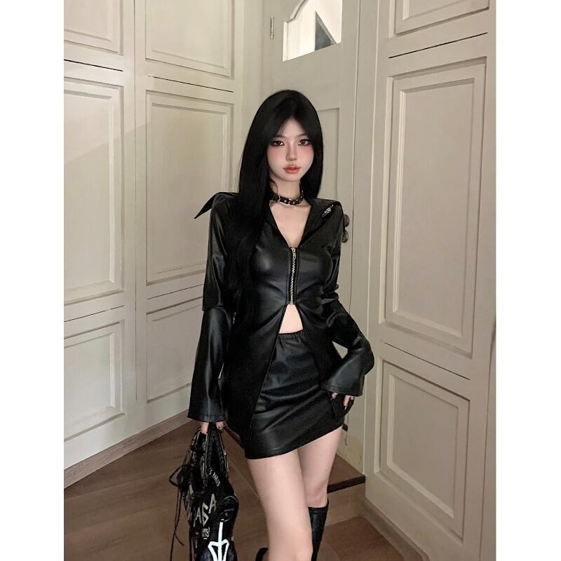 ホットガールズスーツ秋スプライス PU レザージッパージャケットトップウエストショートスカート 2 点セット服 オータム 秋物