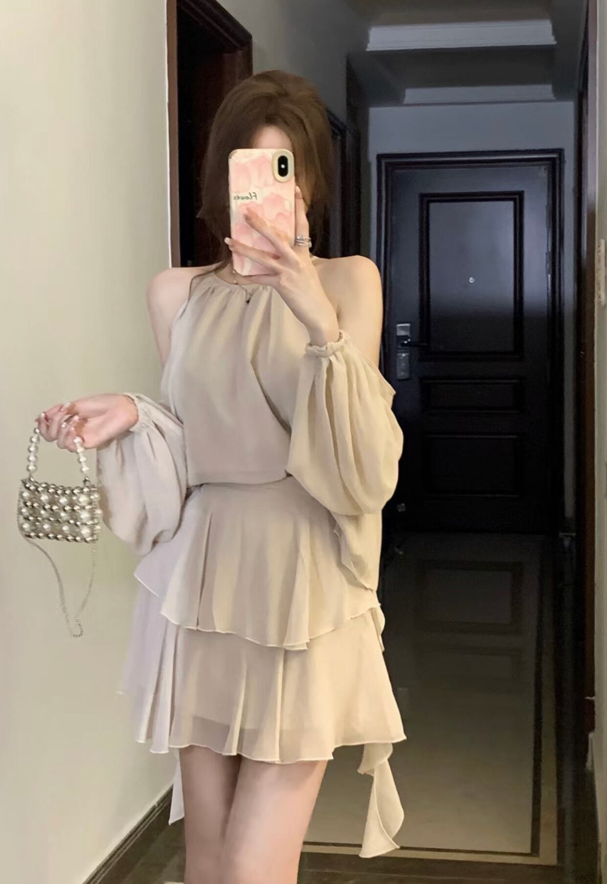 甘いホットガールスーツ夏ホワイトネックホルターオフショルダーシフォントッププリーツショートスカートツーピースセット服 大人ガーリー スウィート キュート カジュアル サマー 夏物