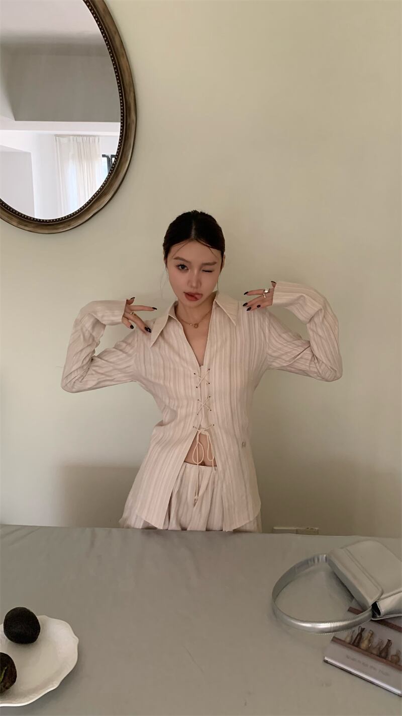 スイートガールスーツ夏ストライプターンダウン襟レースアップシャツ花ショートスカートツーピースセット服 大人ガーリー スウィート キュート カジュアル サマー 夏物
