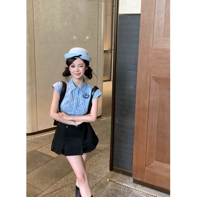 ese プレッピースタイルスーツ夏ストラップパンツ半袖ストライプシャツトップ 2 点セット服 サマー 夏物
