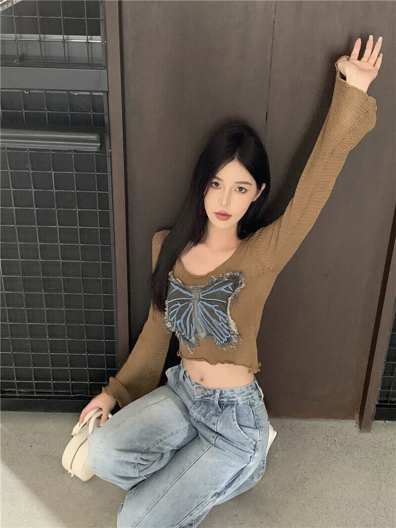 甘くてクールホットガール蝶パッチニットシャツ秋ショートユニークフレアスリーブショートトップ服 大人ガーリー スウィート キュート カジュアル オータム 秋物
