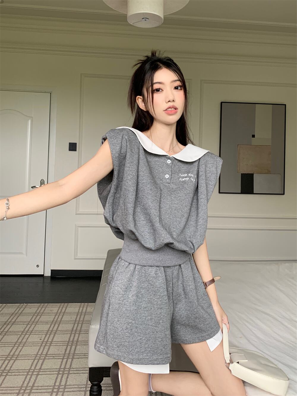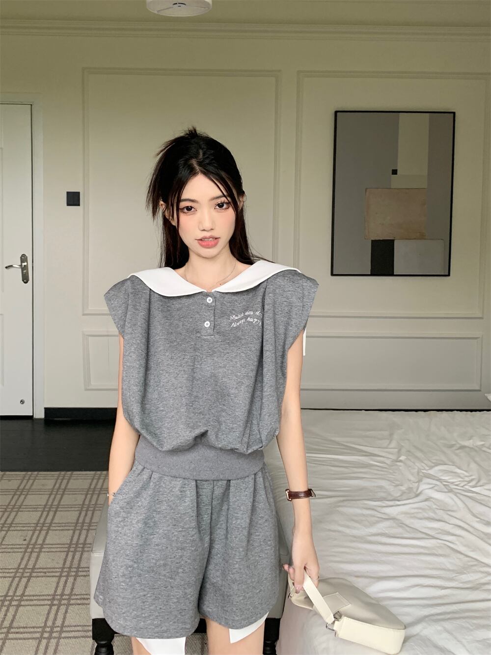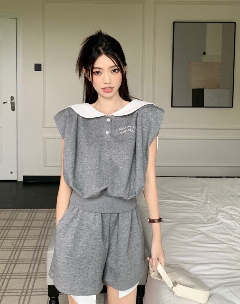 ホットガールスポーツスーツ夏コントラストセーラー襟ノースリーブトップウエストショーツ 2 点セット服 サマー 夏物 ブルマー