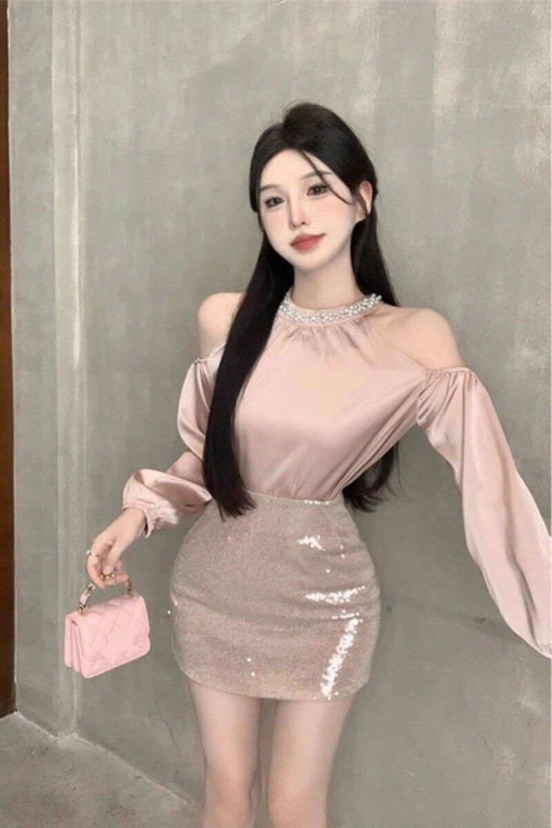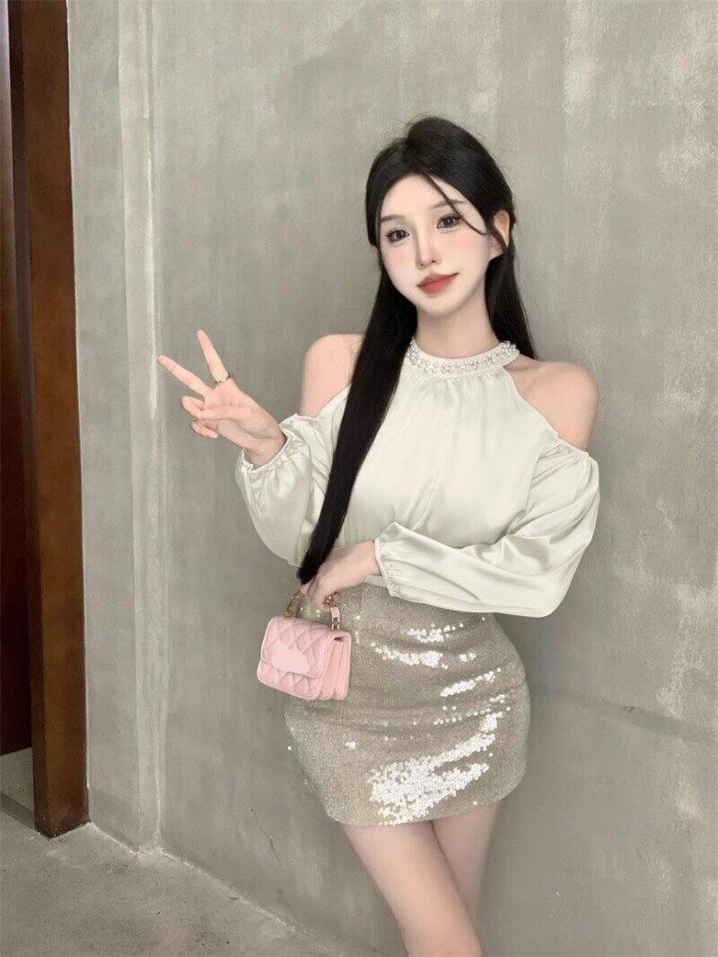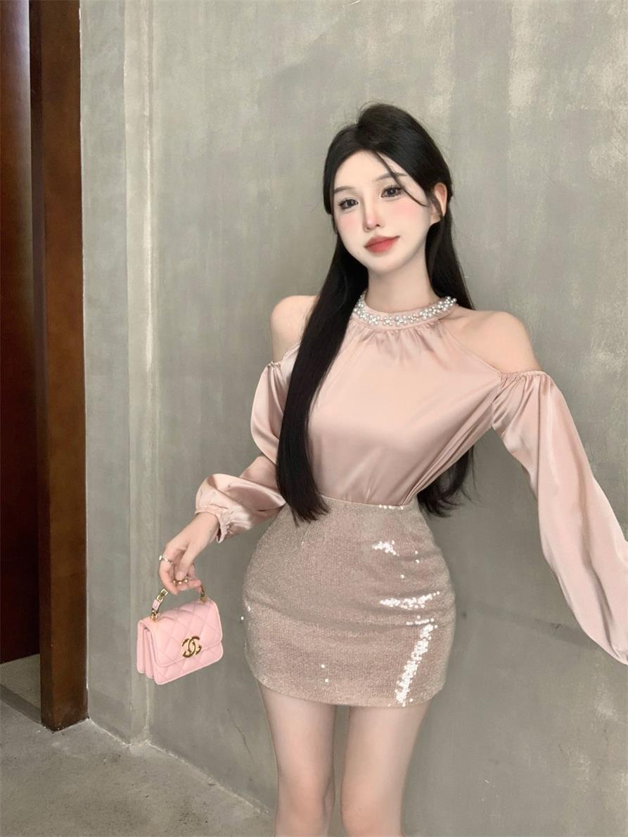 フレンチスウィートガールスーツ秋オフショルダーパールホルターネックトップラップヒップスカートツーピースセット服 大人ガーリー キュート カジュアル オータム 秋物 真珠