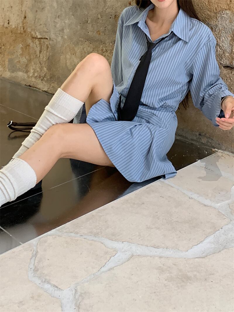 アメリカン プレッピー スタイル スーツ レディース 秋 プリーツ ポロネック ストライプ ドレス ルーズ ニット 長袖 カーディガン 2 点セット ロング オータム 秋物 Oネック