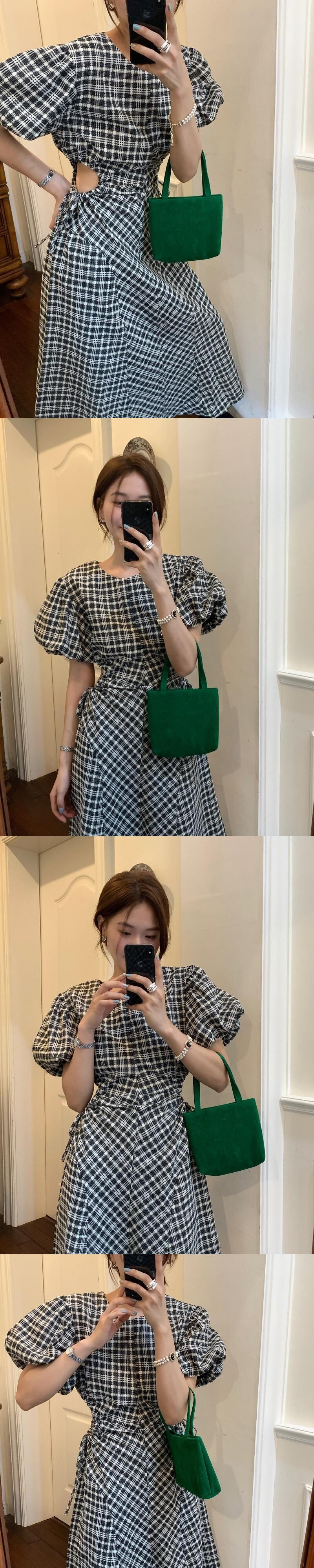 フレンチウエスト A ライン オープンウエスト 巾着ドレス レディース チェック柄 バブルスリーブ ラウンドネック ドレス服 Oネック Aライン
